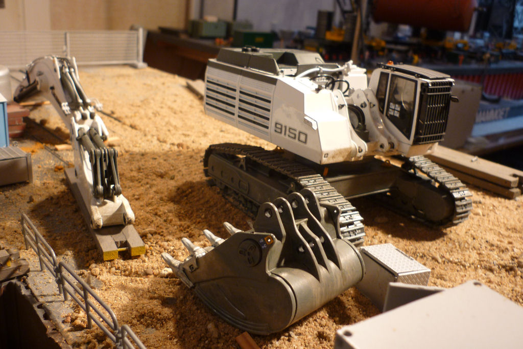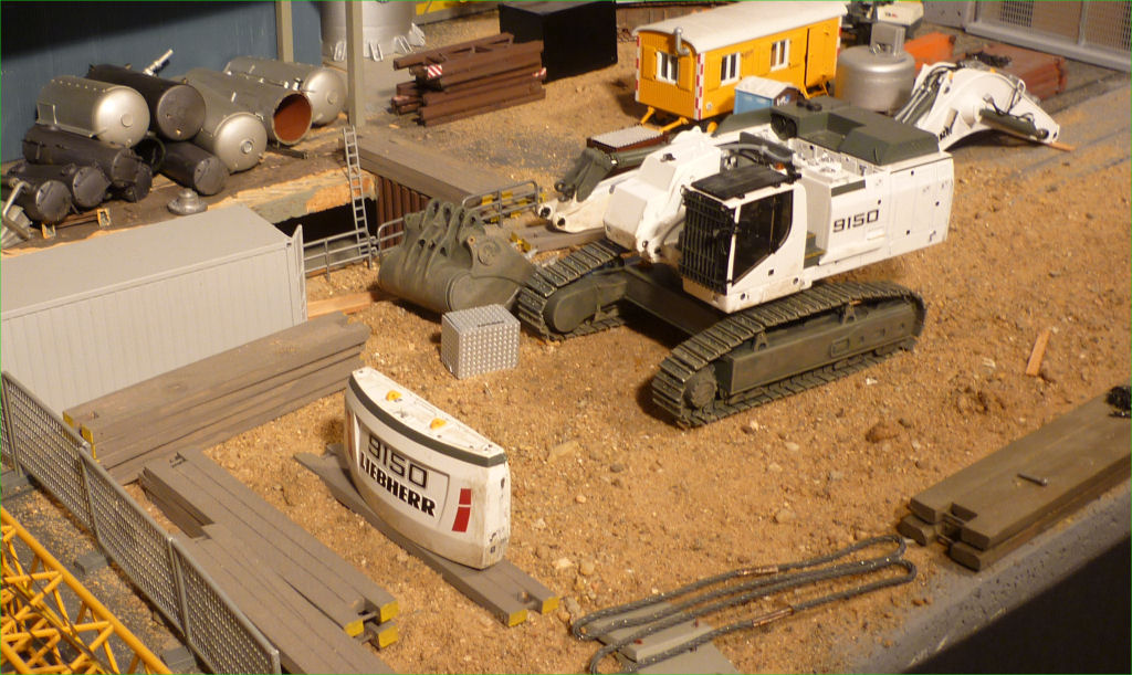 Jedenfalls ist der 130 t schwere Bagger, wie bei solchen großen Geräten üblich in Einzelteilen gekommen. Löffel, Baggerstiel, Monoblockausleger, Ballast und die 74 t schwere Grundmaschine warten darauf zusammengesetzt zu werden...