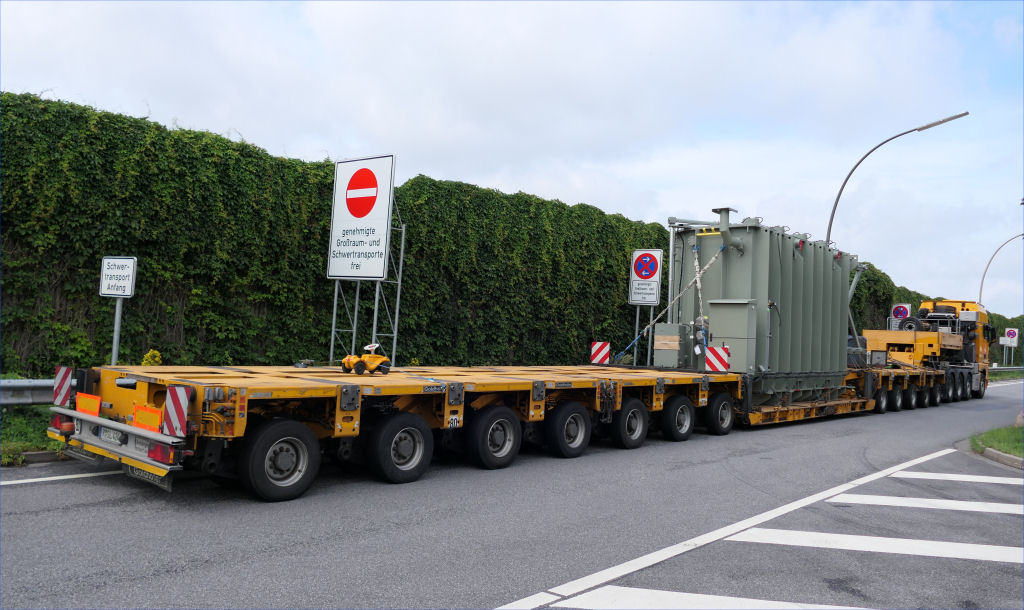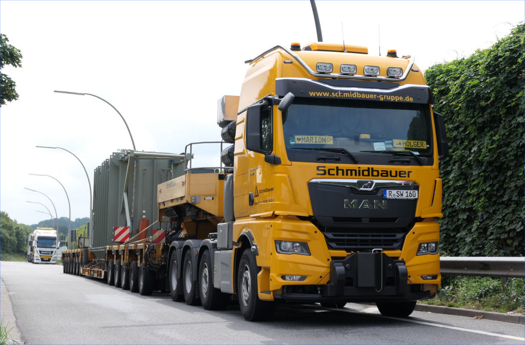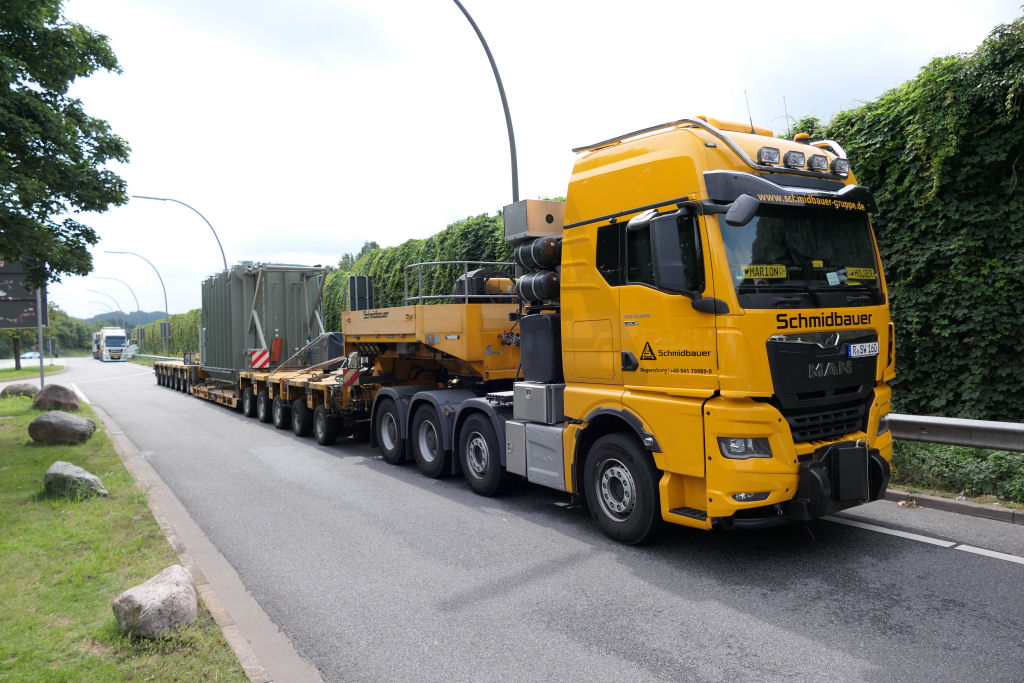 Schmidbauer MAN 41.640 TGX mit Goldhofer THP SLS 5-7 mit Trafobrücke und Transformator für ein Umspannwerk in Schleswig Holstein.