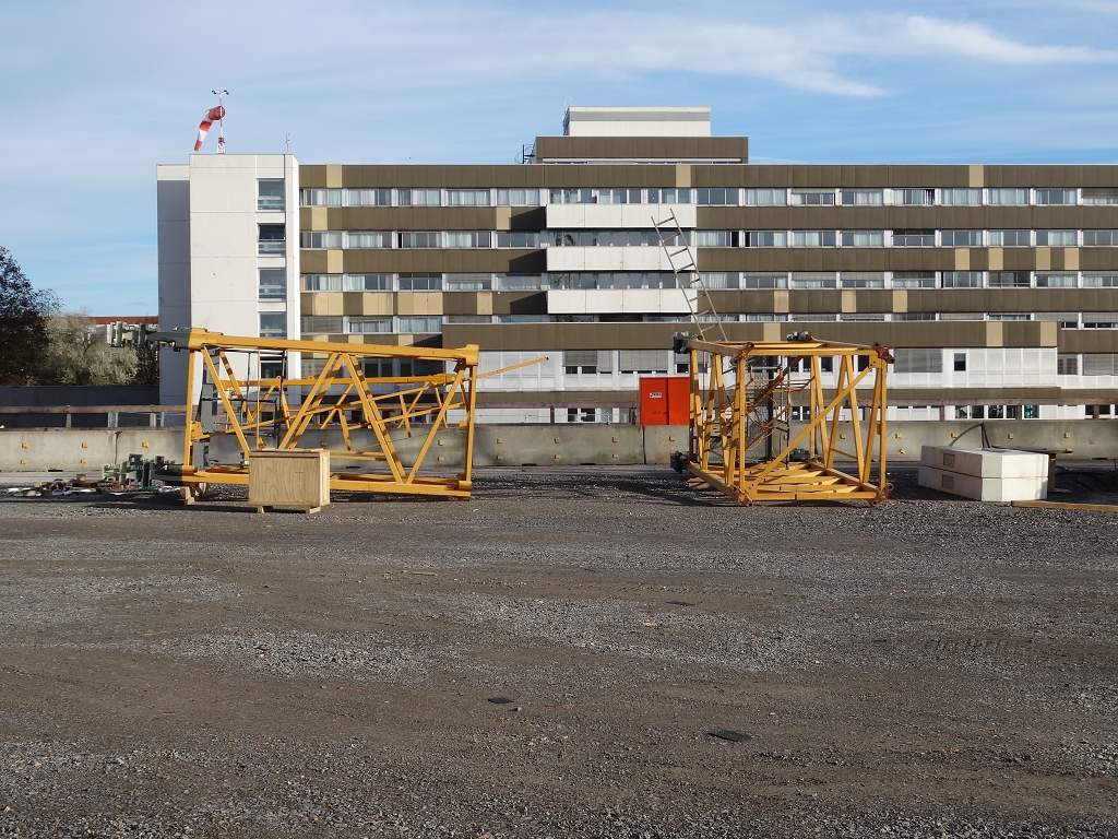 Einige Teile für einen dritten Kran selbiger Art liegen auf einem Lagerplatz in Baustellennähe.