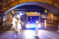 Feuerwerhr Einsatzfahrten durch die Stresemannstraße Höhe Bahnunterführung. Lage nach Gasaustritt irgendwo in HH Bahrenfeld. Diverse Einsatzfahrzeuge, Sonderfahrzeuge, Polizei...
