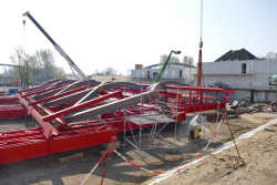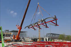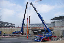 Krandienst Schulz AC 500-2, einheben des ersten Konstruktionsteiles der Überdachung des Bahnhof Neubaues S Bahn HH Elbbrücken.