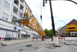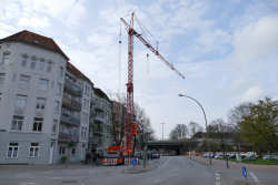 Krandienst Schulz Liebherr MK 88 Plus im Einsatz bei einer Balkonmontage in HH Barmbek.