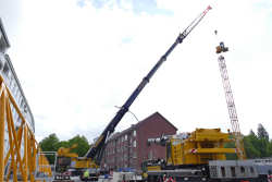 Thömen LTM 1500-8.1 Montage Potain MD 219 Hochbaukran Oberwagen Mittelteil, Gegenausleger und Hauptausleger. Danach Abrüsten des Telekranes bis zur Abfahrt.