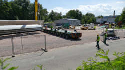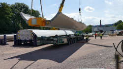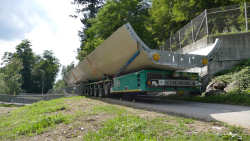 P.Schwandner Verladung und Transport von Turmschalen für Vestas WEA Türme für den Windpark Glaserkopf in der Gemeinde Hasel, oberhalb von Wehr im Schwarzwald. Transport mit Goldhofer PST 12 SL Selbstfahrer vom Umladeplatz Richtung Windpark.