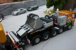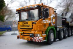 1/50 Modell Holtrop V.d. Vlist Scania P 6 Flachdach 10x4 mit Nooteboom 1-4 Euro ICP Tieflader von WSI Models.