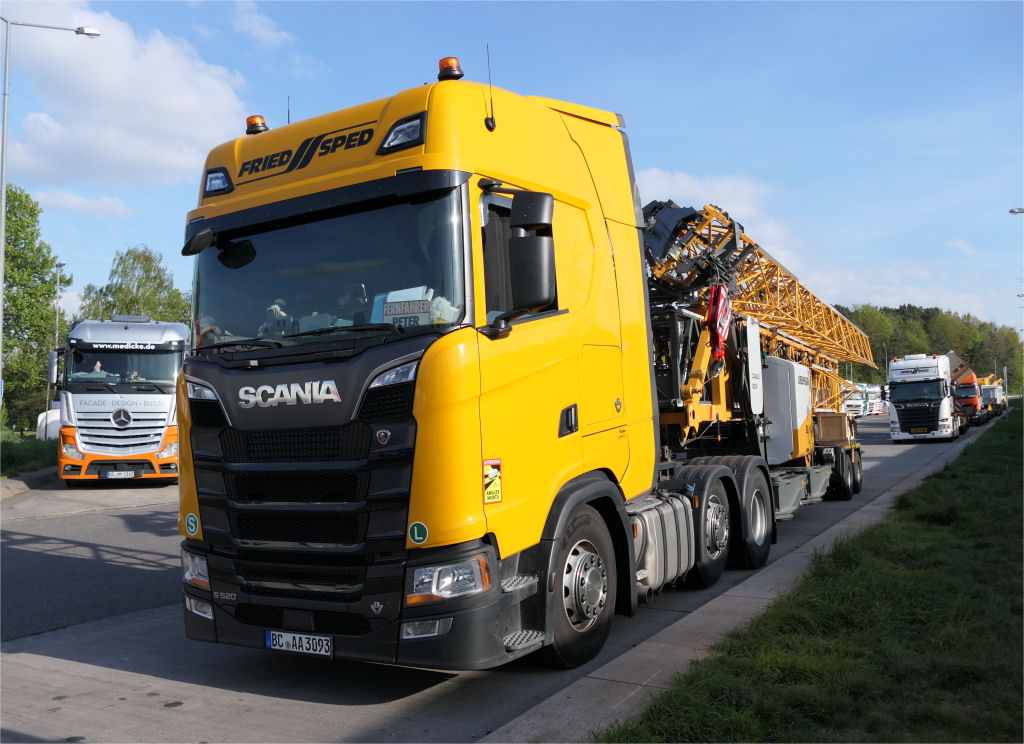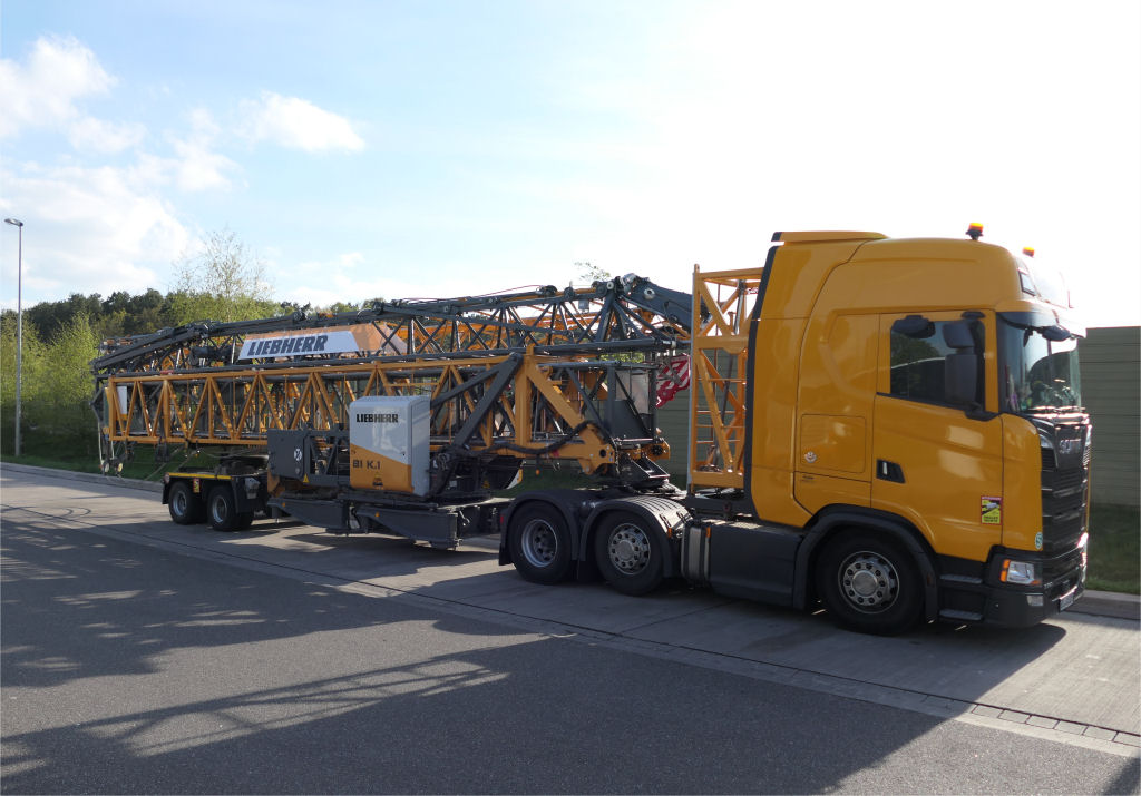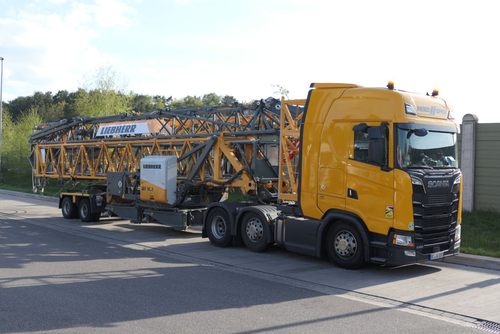 Interessant die Mitnahme von Turmteilen für den Baukran, hinter dem Fahrerhaus der Zugmaschine.