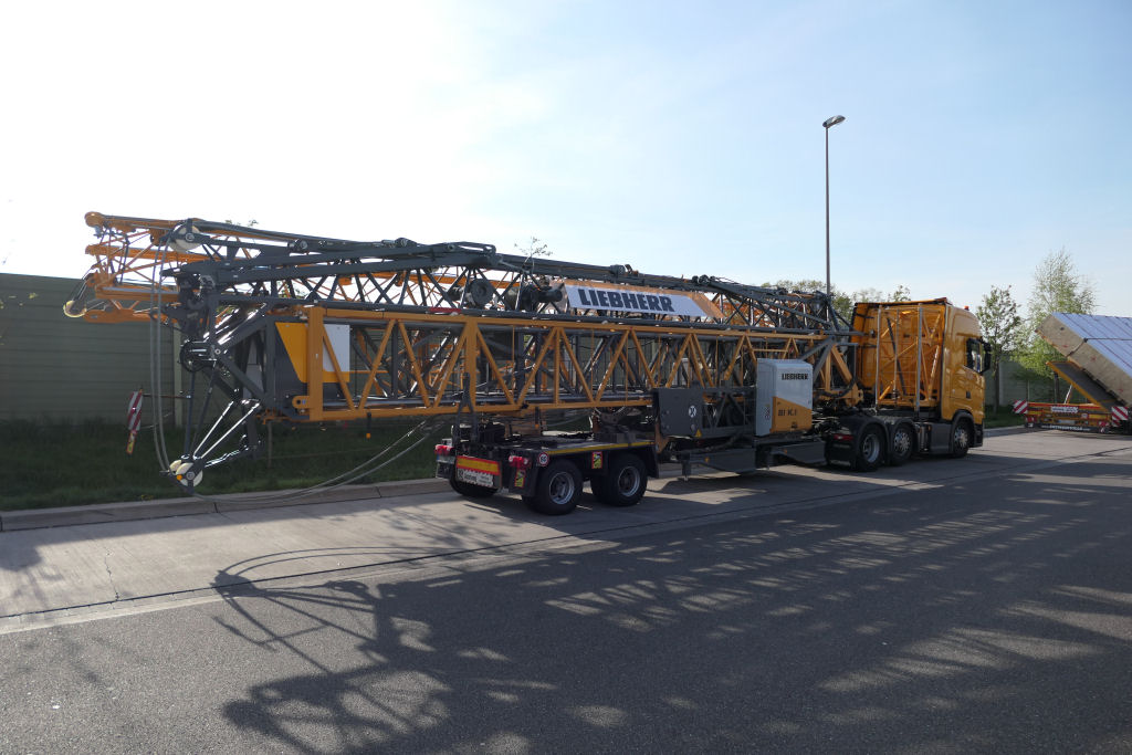 Die Gleich-Hinterachse ist verladen und im Hintergrund steht der fertig abgesattelte Baukran.