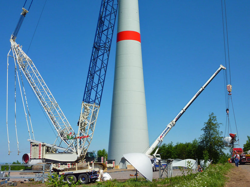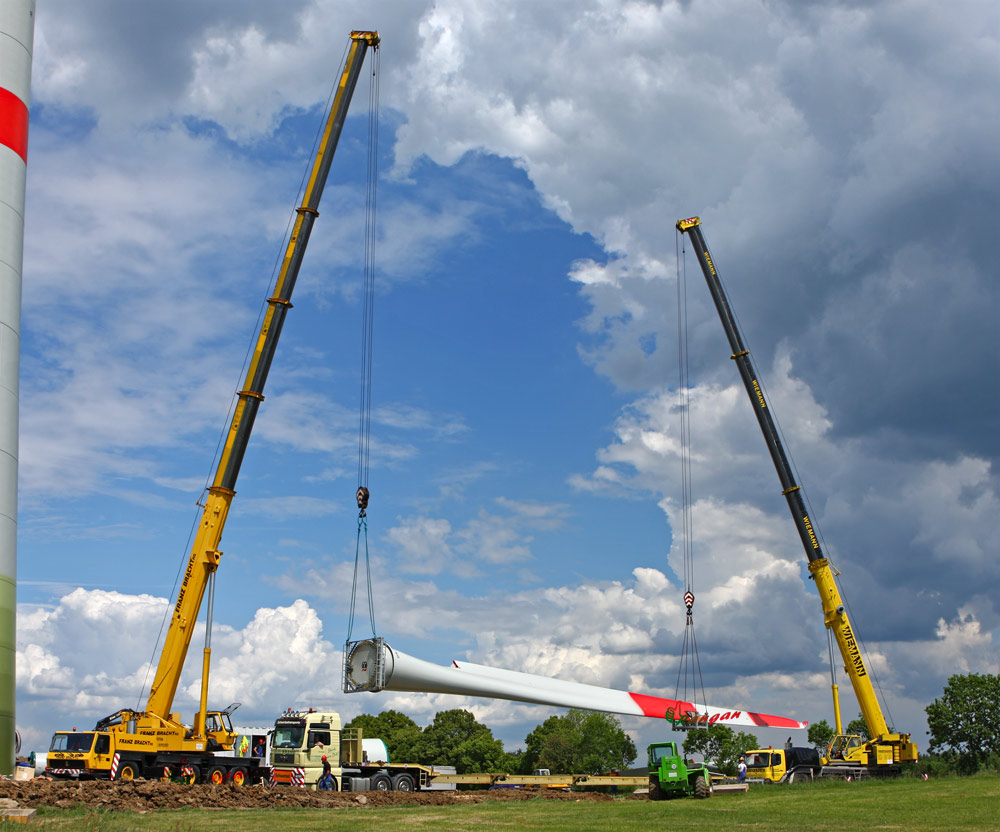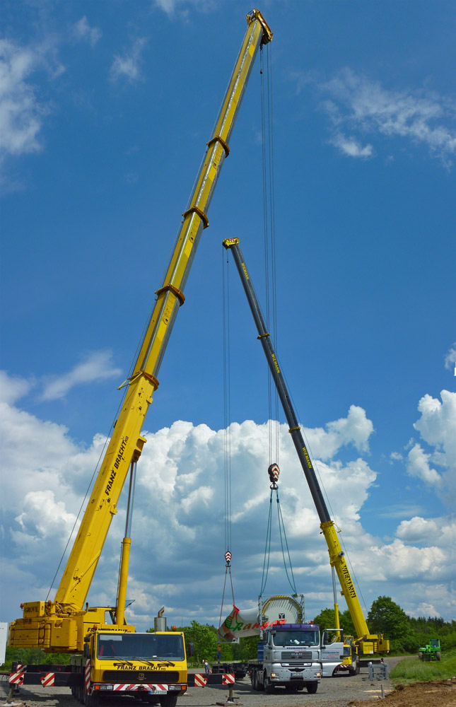 Für die nächsten 2 bis 3 Monate stehen eine LR 1600 und eine LTR 11200 inmitten der hessischen Wälder auf der WKA-Baustelle, sieben 138 m Anlagen werden montiert. Die Aufbauarbeiten der Krane sind abgeschlossen, in den nächsten Tagen werden wahrscheinlich dann die Montagearbeiten den Anlagen beginnen.