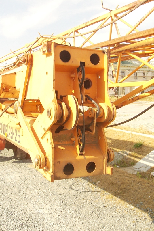 Bei dem neueren Cadillon Chronflash 30TL wird ein Biegebalkenausleger verwendet, der ebenfalls nach oben hydraulisch überklappt. Also hat man nicht mehr den Nachteil zum Potain IGO, dass man im Betrieb den Ausleger nicht verkürzen kann. Allerdings um den Preis, dass die Transporthöhe nicht mehr ganz so günstig ist, wie bei den alten Chronoflash mit dem nach unten Z-gefalteten Ausleger, siehe Bilder von Hendrik.