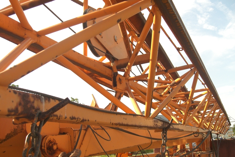 Denn: Wenn man die Potain HD Kranserie mit dem hydraulisch faltbaren Vollwandturm und die Cadillon Kranserie Chronoflash 20 bis 35A miteinander vergleicht, sind diese von unten bis zur Auslegeranlenkung - soweit ich das sehe - strukturell gleich. Der Unterschied liegt im Ausleger bzw. der Auslegerfaltung. Potain-Krane falten ihren Ausleger mit einem Hydraulikzylinder oben herum. Das zweite, vordere Auslegerteil liegt auf dem inneren Auslegerteil, weil beide einen dreieckigen Querschnitt haben. Bei den neuen Kranen mit 3-teiligen Ausleger ist das vorderste Auslegerteil als oben offenes U-Profil ausgebildet und klappt über das Dreiecksprofil des mittleren Elementes. Die Auslegerfaltung kann auch im Kranbetrieb jederzeit verwendet werden, um die Ausladung beim Hindernisvorbeischwenken zu verkürzen. Die Auslegerfaltung ist somit vollständig unabhängig von der Turmfaltung/Aufstellkinematik. Gravierender Nachteil dieses Konzeptes: Die Transporthöhe des Krans mit eingefalteten Ausleger ist recht hoch, weil die Auslegerteile eben übereinander und über dem gefalteten Turm liegen.