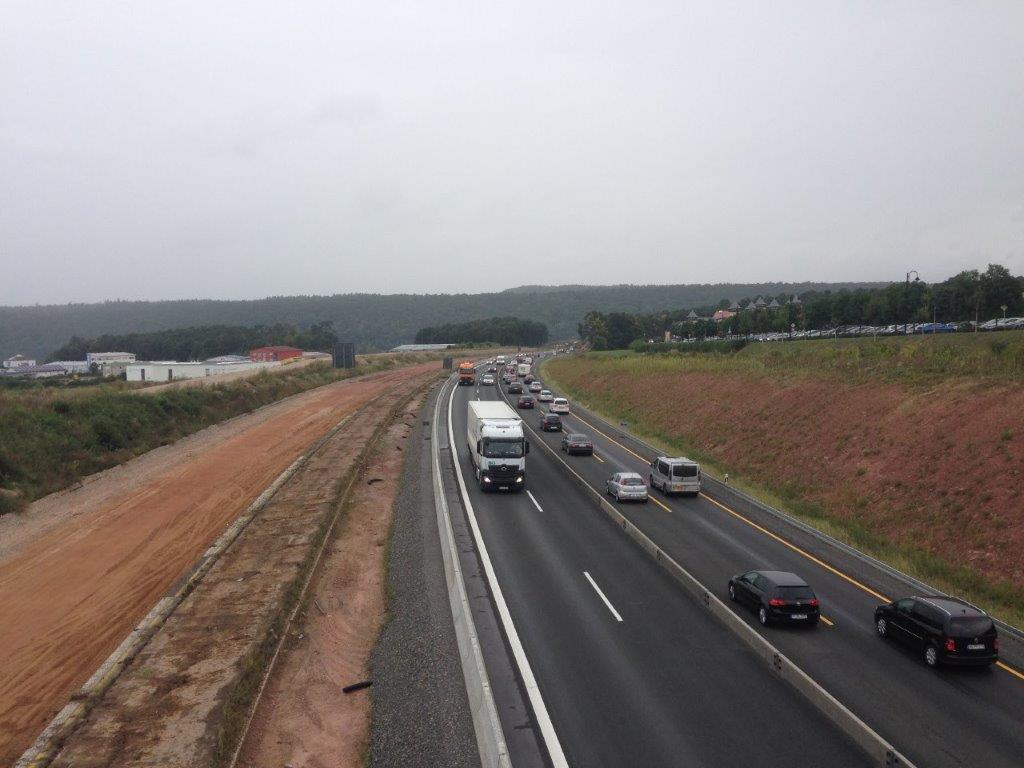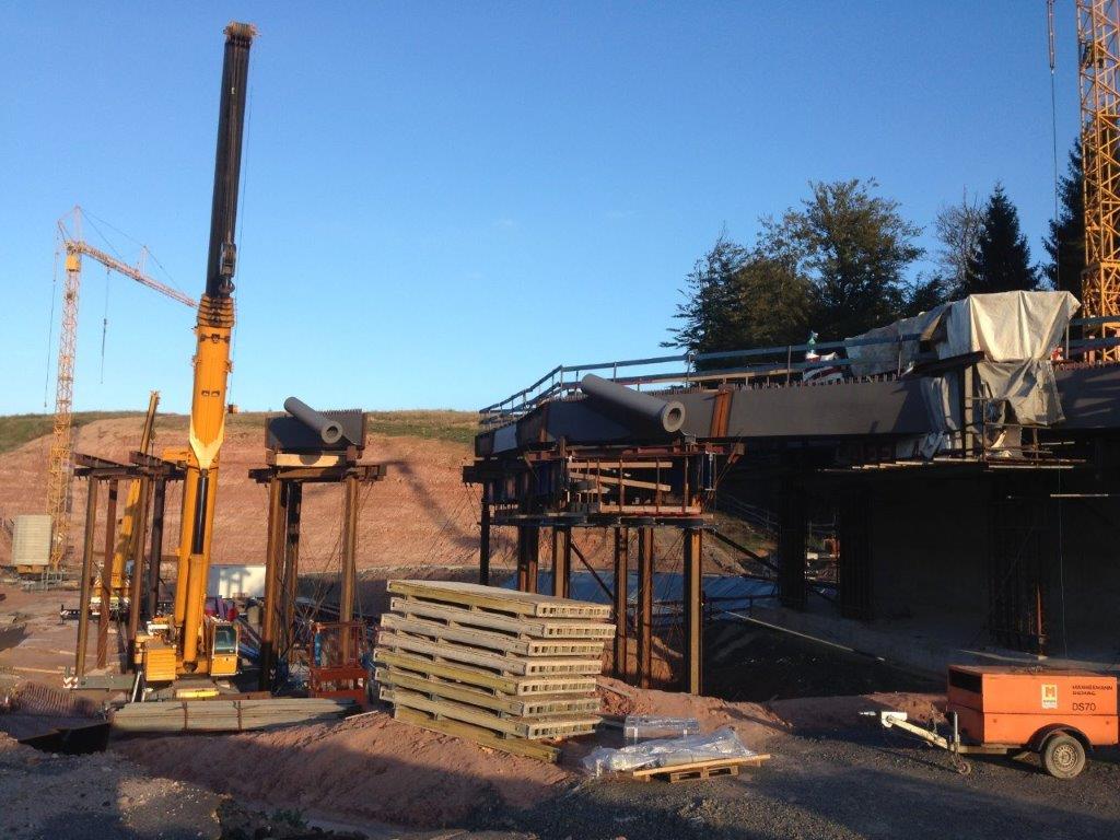 Interssant sind auch die rohrförmigen Stützpunkte für die Halteseile. In der 3D-Simulation der ABDNB sind nur einseitig Halteseile dargestellt, was eine bemerkenswerte Statik zur Folge hätte. Nun sind offensichtlich doch beidseitig am Fahrbahnträger Halteseile vorgesehen. Bei genauer Betrachtung der auf dem Boden liegenden Teile erkennt man außerdem, dass sie nicht die auf dem Stützgerüst liegende Konstruktion ergeben können. Ein Rohrstutzen zeigt dazu in die falsche Richtung. Diese Teile hätten aber sehr gut zur 3D-Simulation gepasst. Es kann durchaus sein, dass die ausführende Baufirma den Architekten korrigiert hat. Ich bin gespannt, wie das weitergeht.