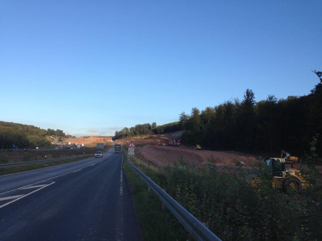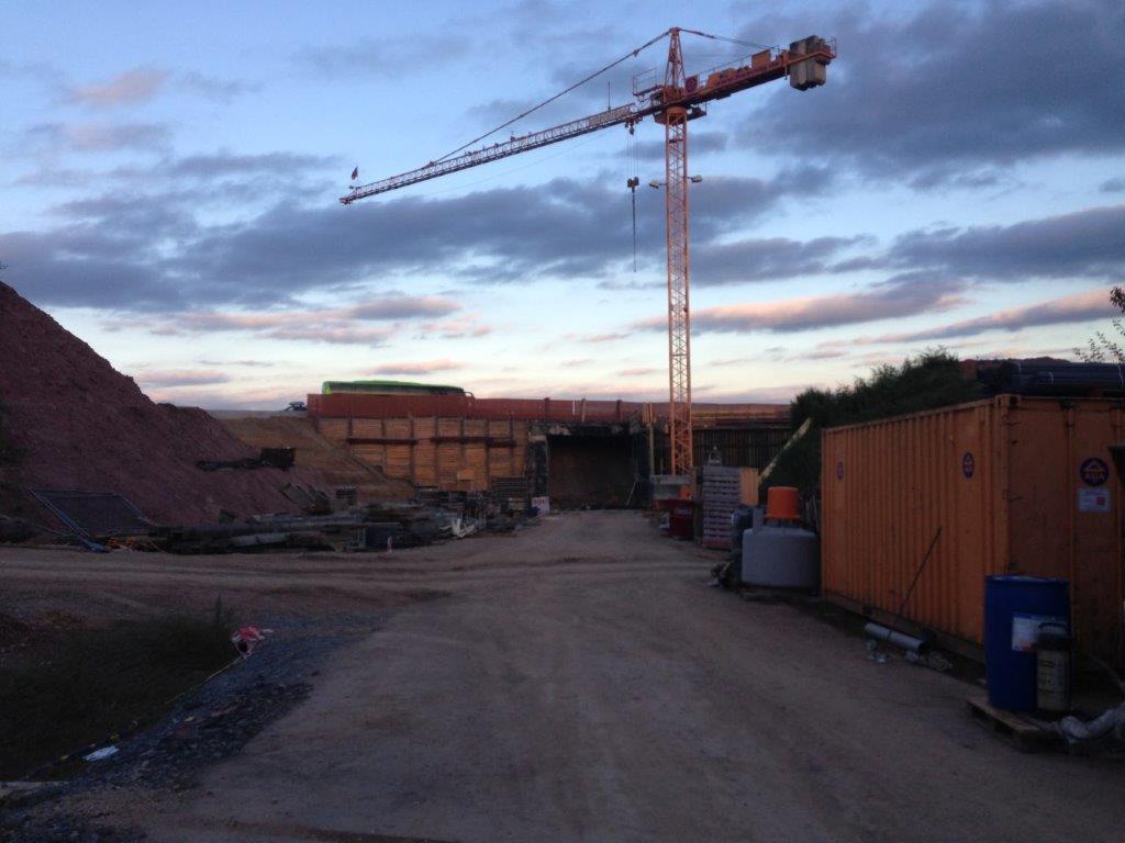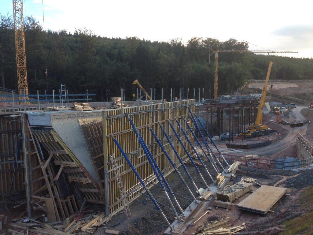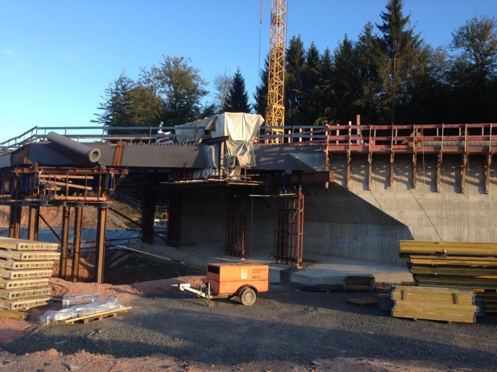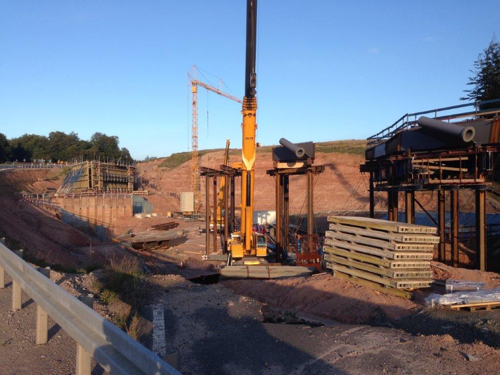 | Zitat: | Sebastian Suchanek postete: An der Brücke St2312 ist der LTM1200-5.1 von Wissel wieder abgezogen, der LTM1220-5.1 vom Würzburger Kranverleih wurde umgesetzt. Die Stahlbauteile liegen jetzt anscheinend in ihrer richtigen Position auf dem Stützgerüst. Außerdem wird nun der Sinn der tiefen Baugrube am Widerlager und der darin wieder hoch betonierten Fundamente für das Stützgerüst klar: Dort hinein kommt wahrscheinlich das Widerlager für den Monobogen - zumindest wurde dort begonnen, größere Mengen Armierungen vorzubereiten: |