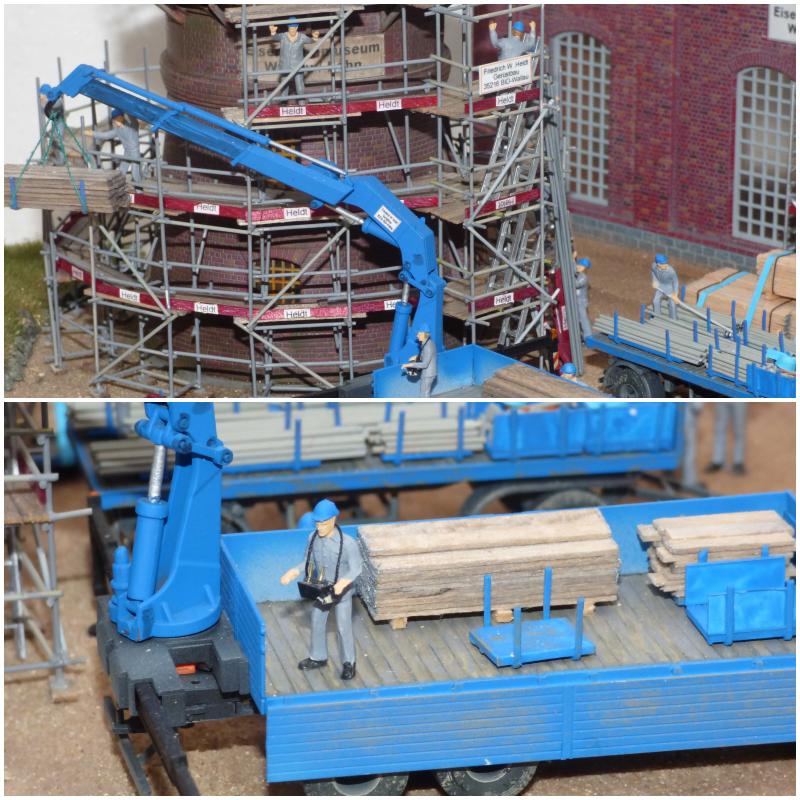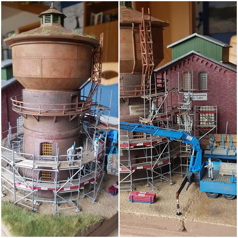Die folgenden Kibri Bausätze wurden verwendet: Nr. 39428 Wasserturm Ottbergen Nr. 9940 / 39940 Wasserkran. Nr. 39430 Dieseltankstelle. Nr. 39434 Bekohlungs- und Besandungsanlage. Der Lokschuppen besteht aus Restteilen. Nr. 10874 Abrollkipper ohne Container, aus der Restekiste ein Ladeboden. Nr. 10308 LKW und einem Ladekran Nr. 10988 ATLAS Typ 500.1-13.9/5. Nr. 10540 nur den Anhänger Nr. 10204 Zweiwege-Bagger.
