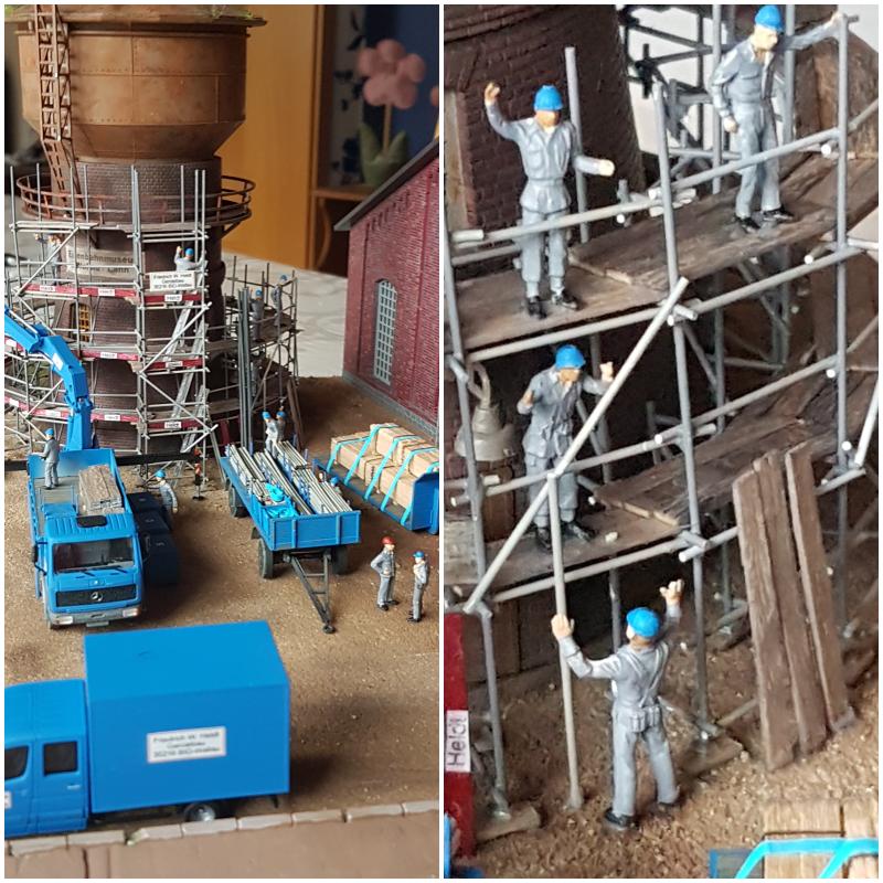 Das Diorama ist entstanden durch Anregungen auf dem Seminar „Faszination Baustelle“ der Fa. Viessmann . Da viele der Teilnehmer eher Modelleisenbahner waren kam die Idee auf eine Baustelle mit einem Modelleisenbahnmotiv zu verbinden. Das Diorama besteht aus zwei Modulen, Modul-A mit Lokschuppen und Wasserturm und Modul-2 mit Bekohlungs- und Besandungsanlage, Dieseltankstelle, Entschlackung und Wasserkran. Modul-A: Der Lokschuppen entstand aus Restteilen in Reliefbauweise und ist schon frisch renoviert, nur das letzte Fenster muss noch gestrichen werden. Modul-B: Auslegen des Gleisbildes für die Lokbehandlungsanlagen.
