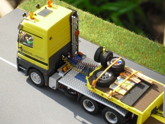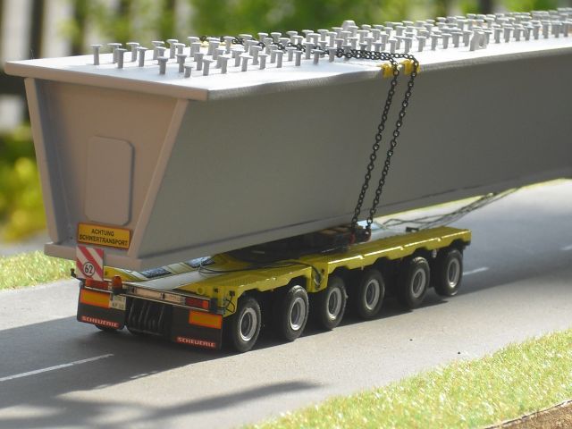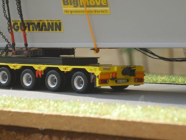Wie kommst du auf die Idee das man solche Kombinationen nur im Hängerbetrieb fährt??????????????? Deine Annahme ist so nicht Korrekt!!!!!!!!!!!!!!!! Technisch ist das eine wie das andere möglich, auf weiten Leerfahrtstrecken macht das Verladen des Fahrwerkes durchaus Sinn. Einziger Unterschied von meinen Modell zum Originalbild ist das beim Original der Drehschemel am Semi der Länge nach ausgedreht ist und sich das Fahrwerk mit seinen letzten beiden Achsen am Semi abstützt. Diese beiden Unterschiede habe ich bewusst nicht so wie am Original dargestellt, da mein Modell noch eine Ladung bekommt! Sollte ich die Bildequelle nochmals finden werde ich für dich einen link einstellen!