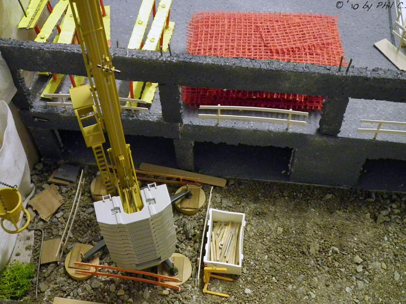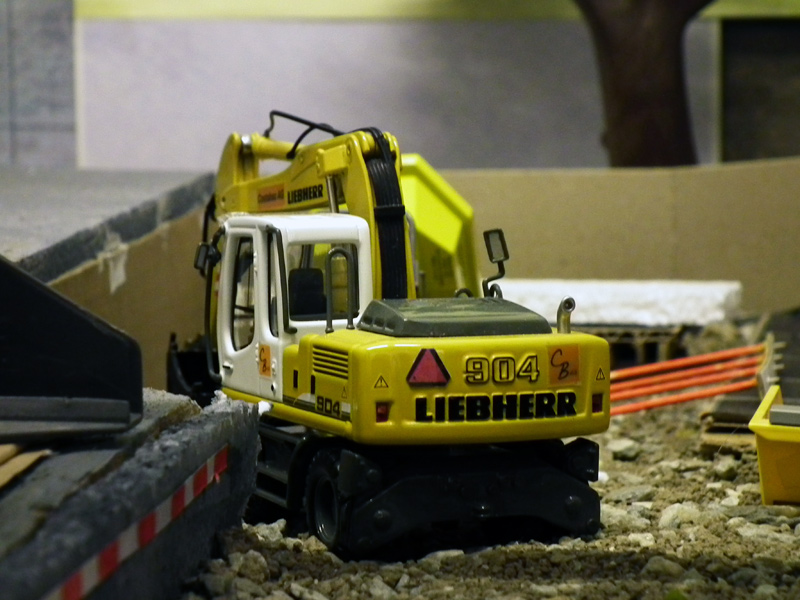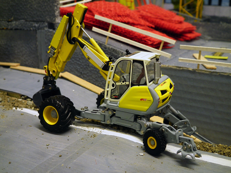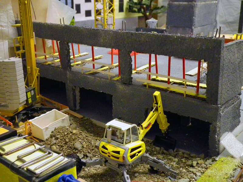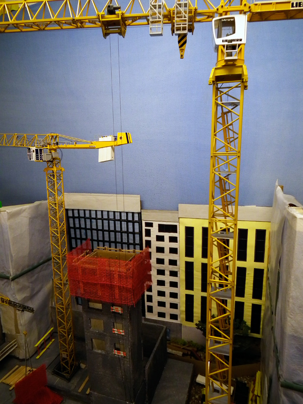 Oben auf dem Dach arbeitet nun der Komatsu PC88MR. Es werden die Liftschächte renoviert (die Aufzüge werden durch grössere, zeitgemässere Kabinen ersetzt. Bald wird mit diesen Arbeiten auch auf dem anderen Hochhaus begonnen.
