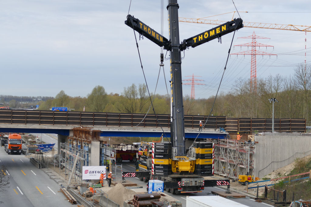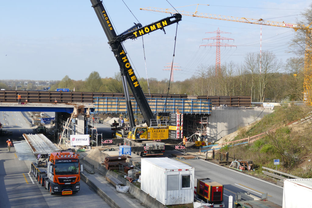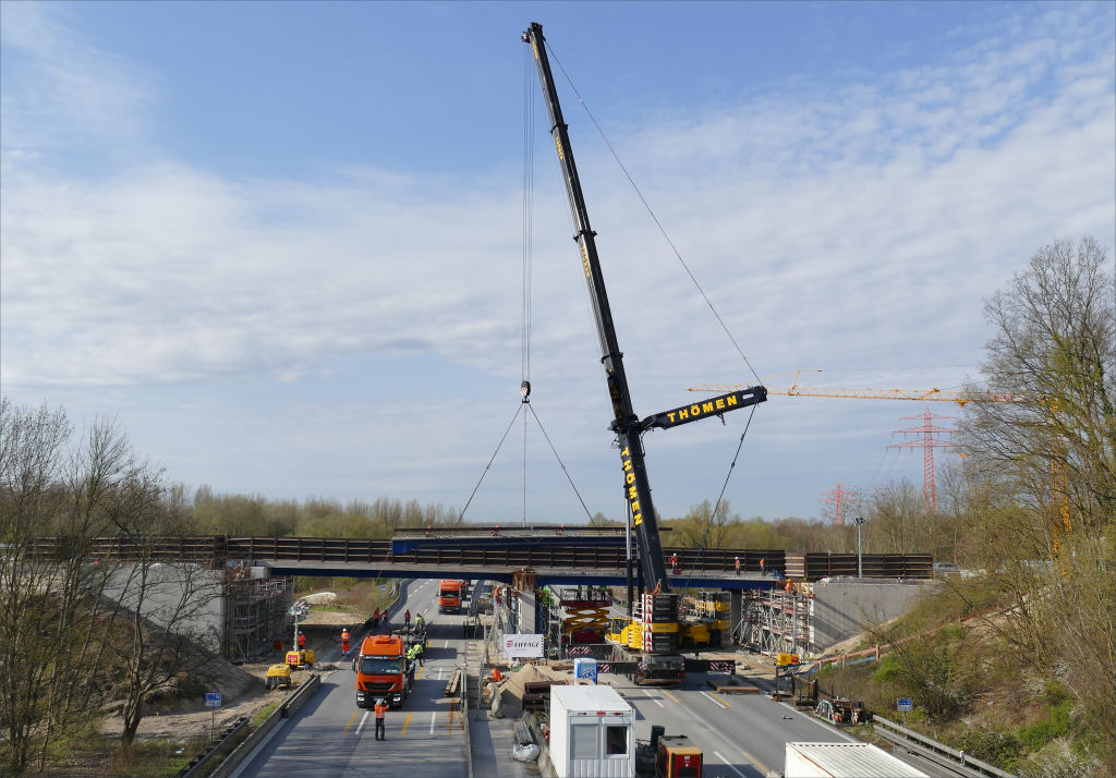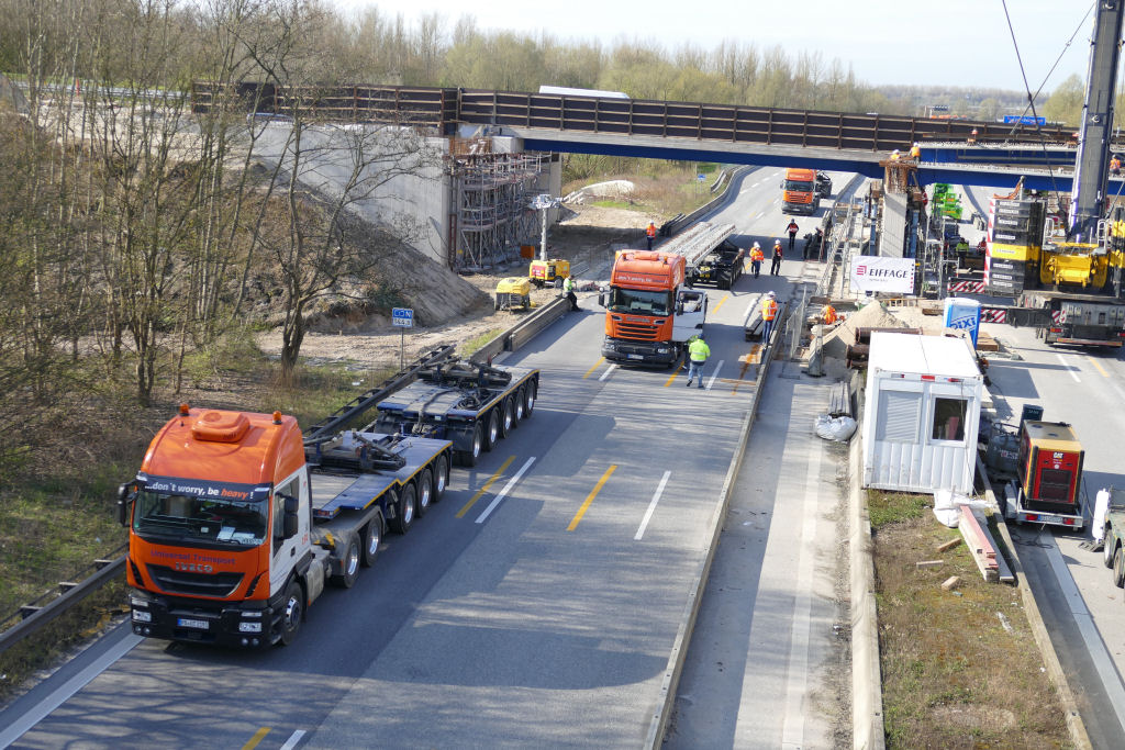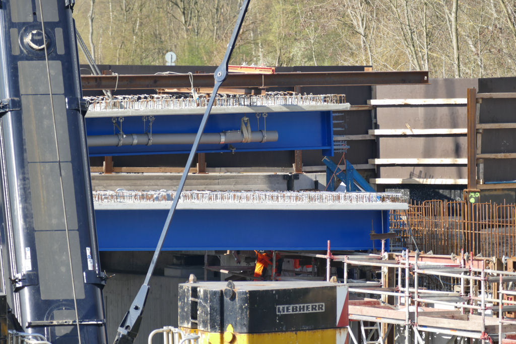 Die Brückenverbundträger sind jeweils 22 m lang, Stahlbinder mit Filigranbetonauflage, sie haben ein Gewicht zwischen 26 t und 37 t, je nach Ausführung.