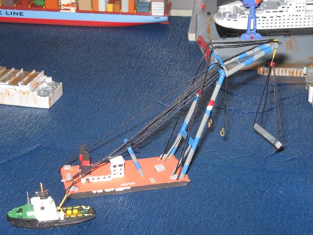 Hallo Baroni + Menzitowoc! Danke fürs Lob ! Der Autokran besteht aus einer 3x3 mm Holzleiste (der Tieflader aus 2x2 mm), aus der die Unter/Oberwagenkonturen mit einer eigentlich viel zu groben Drehmel-Frässcheibe rausgefräst wurden (ich hab leider keine feineren Werkzeuge); der Ausleger ist ein 2x2 mm Evergreen-Vierkant-Profil. Der Mobil-Hafenkran ist auch so eine Eigenkomposition von mir, Unterwagen Balsa-Leiste (eigentlich als Container-Van-Carrierer gedacht) und als Aufbau ein paar Abfallstückchen Rund und Vierkant-Evergreen. So sind auch die Dockkräne des hinteren (großen) Docks gebaut. Die Dockkrane vom kleinen Dock sind fest dort angebracht (Resin-Fertigmodell von NautikArt - ebenso die Maersk-Schiffe). Container-Sattelzüge auch aus 2x2mm Holzleiste. Überhaupt hab ich so viel wie möglich selbst gebastelt (die Schiffe sind ja schon teuer genug). So ist meine Raffinerie aus Spraydosen-Deckeln, Dübeln und ein bißchen Eisendraht entstanden, auch alle Containerkräne aus Evergreen-Profilen und Messingdraht. Gebäude aus Holz und ein paar hat sogar meine Frau aus Fimo beigesteuert. Getreidespeicher aus Gewindehülsen aus dem Baumarkt usw.... Gruß Joachim Und wenns denn interessiert- hier noch ein paar Fotos :