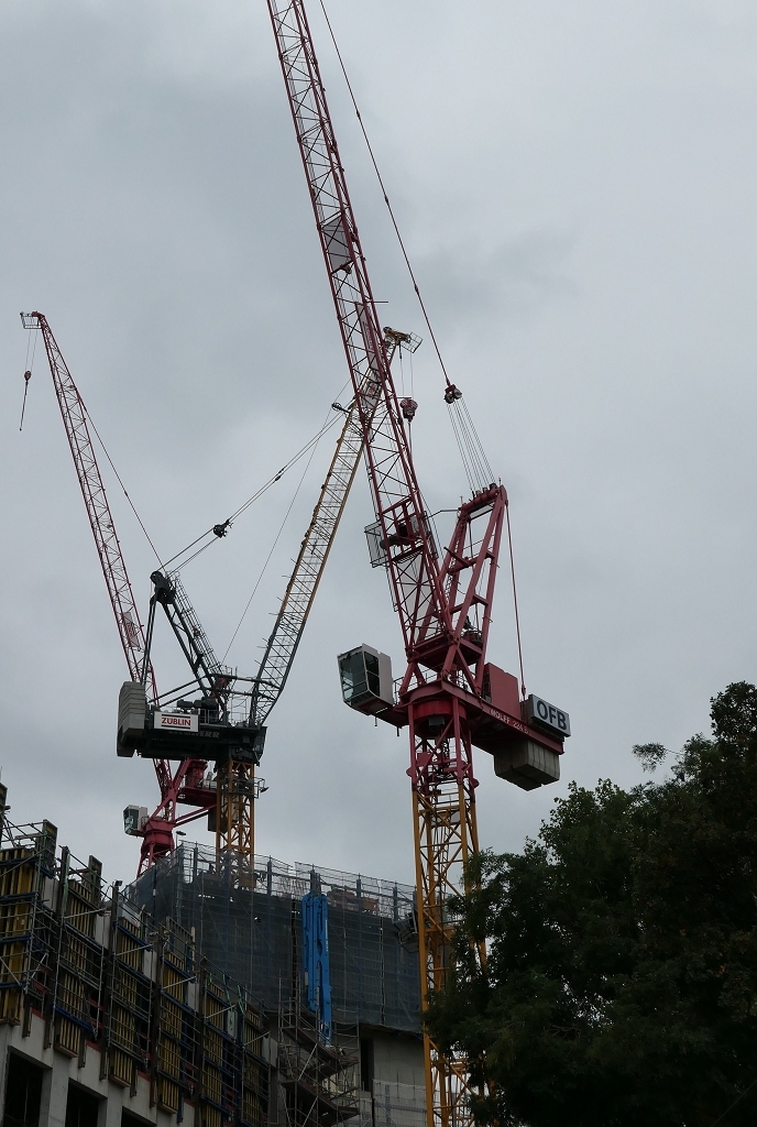 Immerhin zwei der gelanten vier Turmdrehkrane stehen schon , ein Wolff 355B und ein 224B.