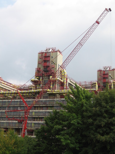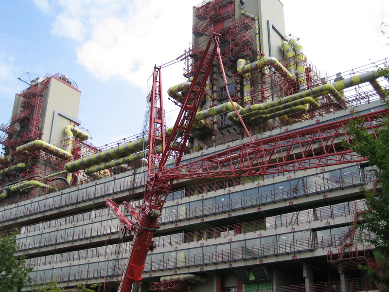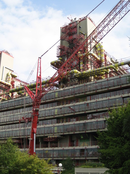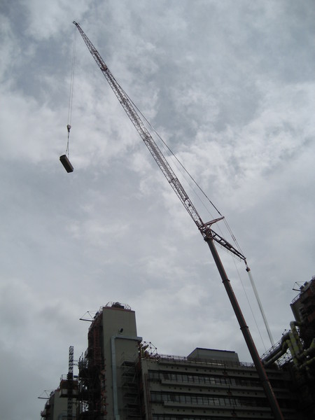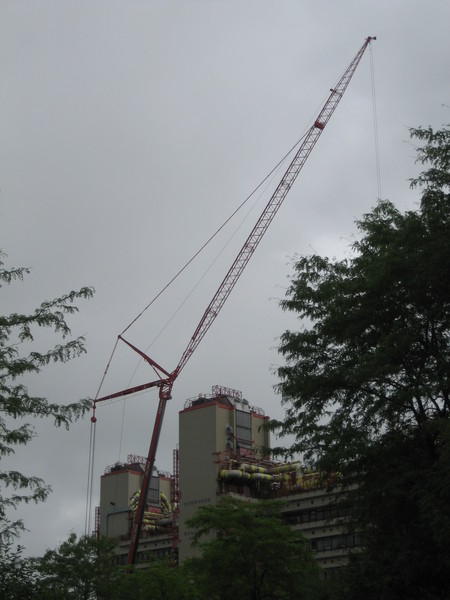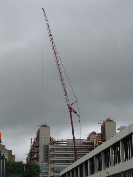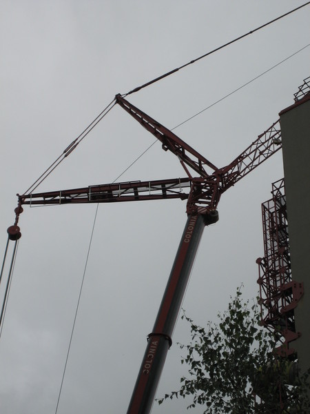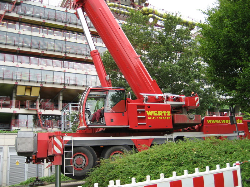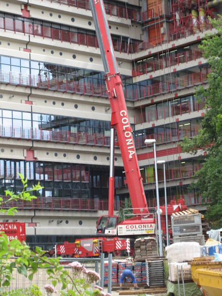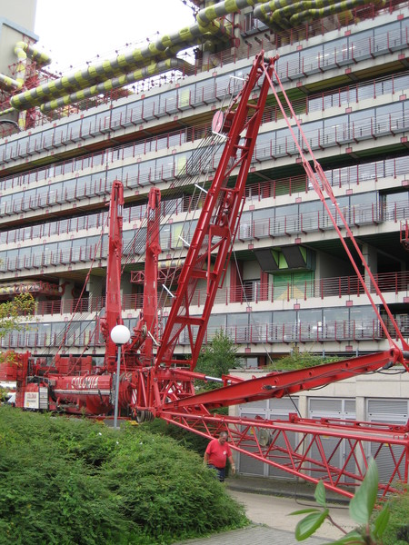 Also: es tut sich mal wieder was, wie ihr wisst (oder auch nicht) wird das Klinikum innen in den 3 obersten Etagen sarniert. seit einem Jahr kommen regelmäßig Krane um die verschiedensten Materialien einzuheben oder auszuheben. nun naht langsam das Ende im 1.Bauabschnitt, was bedeutet, dass sämtliches Material aus dem Inneren des Klinikums gehoben werden muss. Da der TDK nicht mehr vorhanden ist, werden Autokrane mit Wippspitzen eingesetzt.