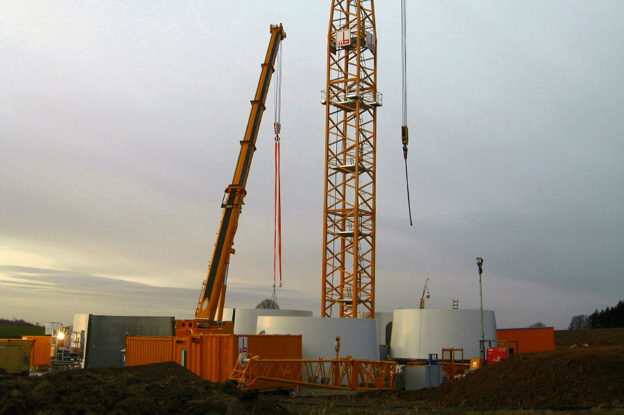 (Rechts hinter dem WKA Turmteil wird gerade die Kabiene auf den Turm gehoben)