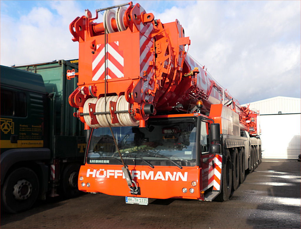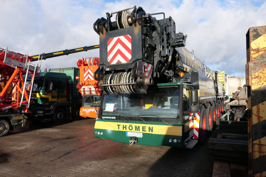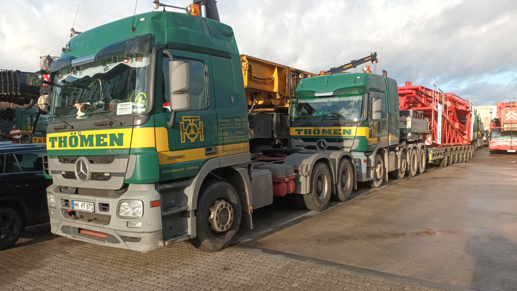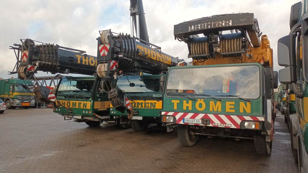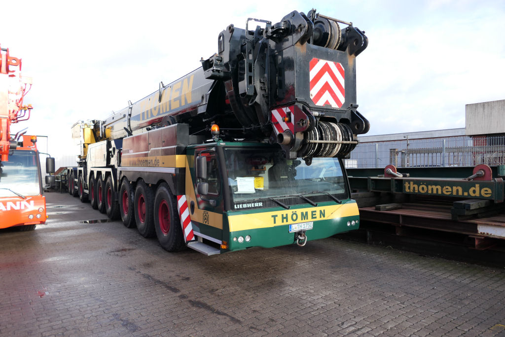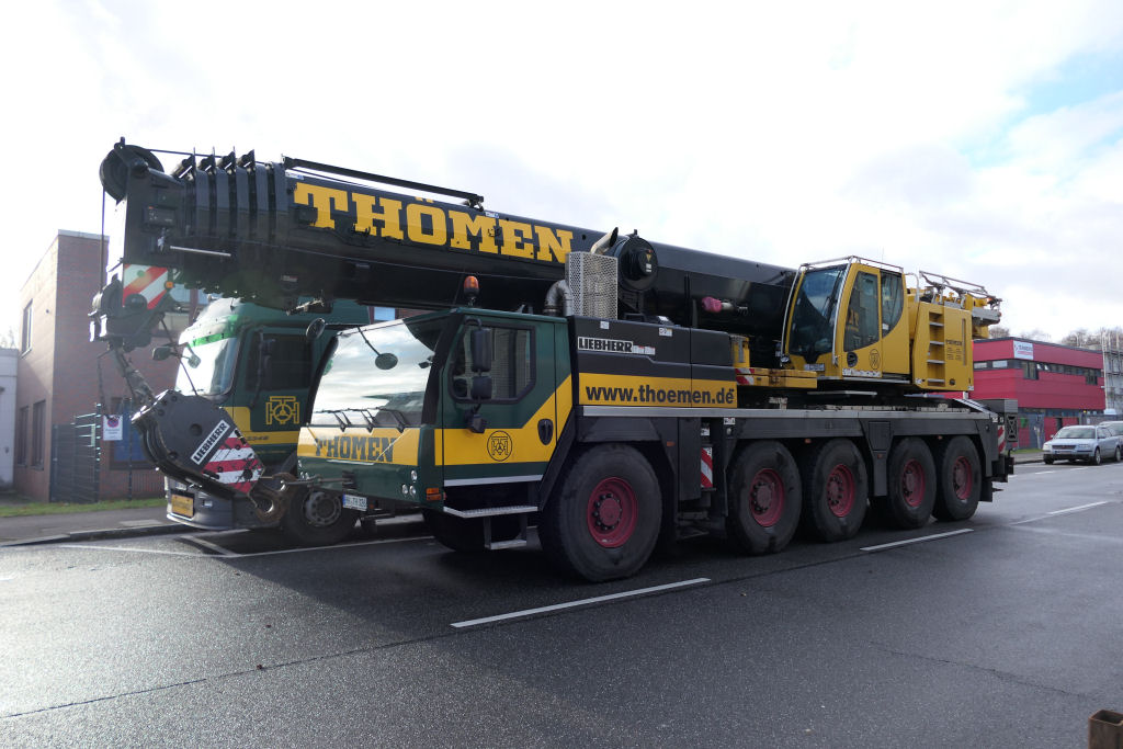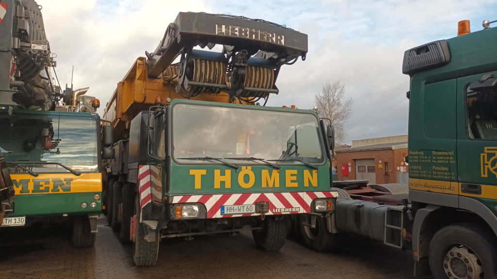 Ich würde mal die Vermutung einwerfen, dass der neue 700 to einfach schon vor der Übernahme für die Hüffermann Gruppe bestellt war und nun kurzerhand in den Thömen Fuhrpark übersiedelt wurde. Umlackieren bei einem Neugerät ist sicherlich zu teuer.