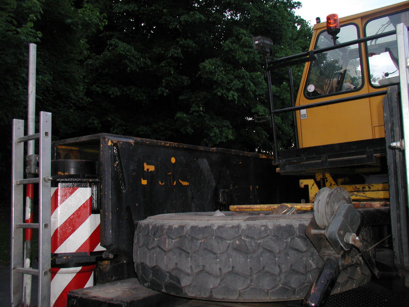 Zwischendurch haben die Liebherrleute die hintere linke Stütze demontiert und bei einer anderen Firma an ein Kran gebaut wo die abgebrochen war.