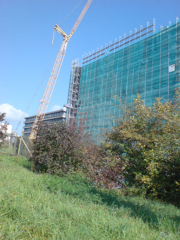 rankommen.Auf dem Gebäude welches angerüstet ist kommt noch ein weiteres Stockwerk darauf ,auf dem Dach müssen Betonteile herausgesägt