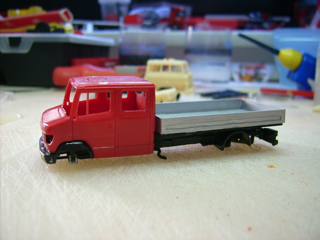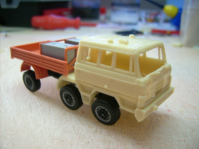 Fahrgestell, Schwerlastturm, Kran und Teile des Aufbaues nehmen Form an.