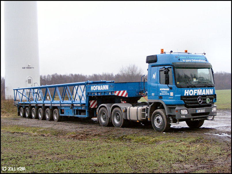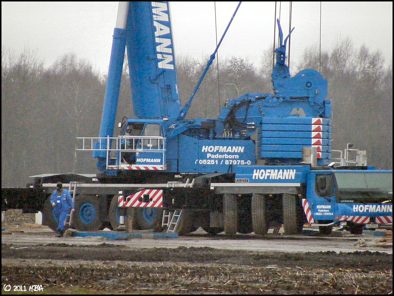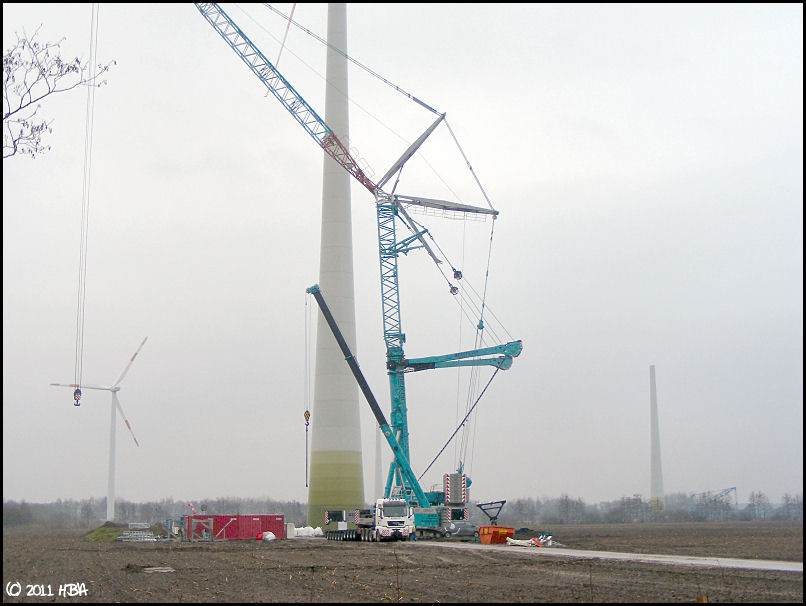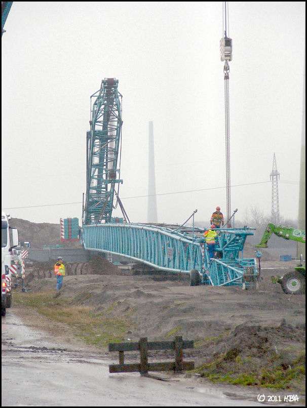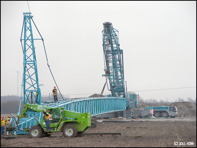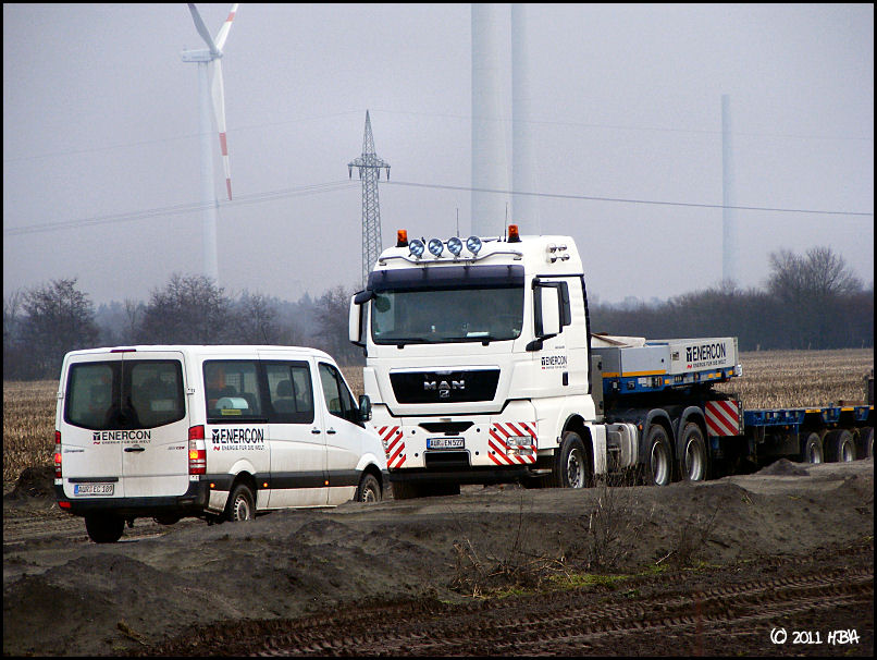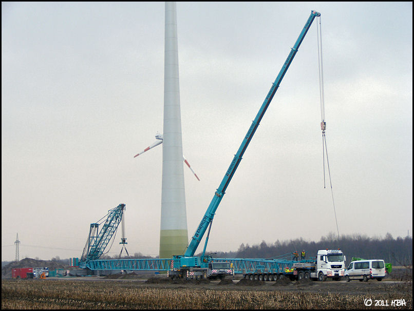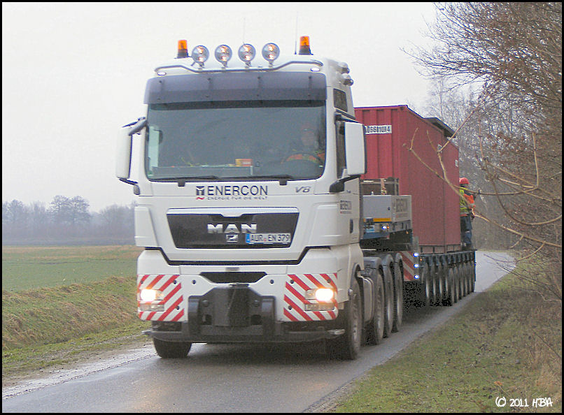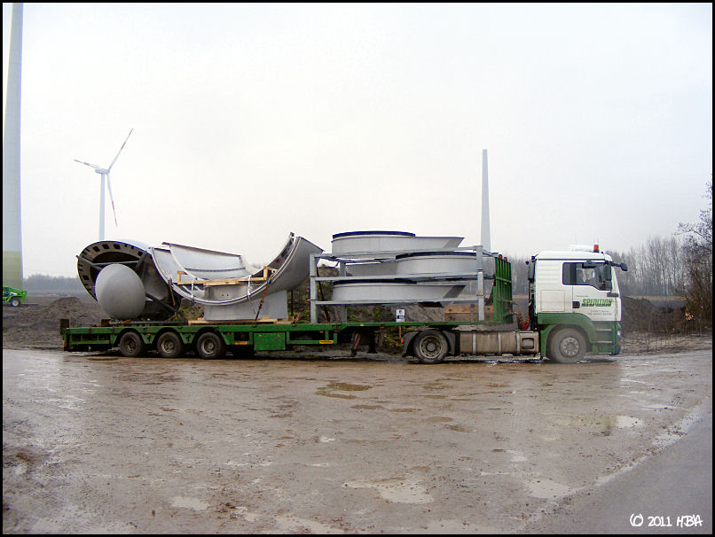 Bei den E101 sind bisher nur Prototypen gebaut worden. Daher schwanken die Gewichte noch sehr stark. Die ersten Maschinenteile (Generator, Nabe, Maschinenhaus) sind jetzt vor 2 oder 3 Wochen von Magdeburg nach Georgsheil transportiert worden. Sie sollen als Vorlage für die Gußformen dienen. Den Transport hat Spedition Franke ausgeführt.