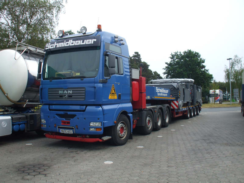 Schmidbauer steht mit 3 Transporten Rasthof Allertal Richtung Hamburg. Ladung: Oberwagen, ein Raupenfahrwerk und Unterteil einer LR 1750. Die geht nach St. Petersburg.