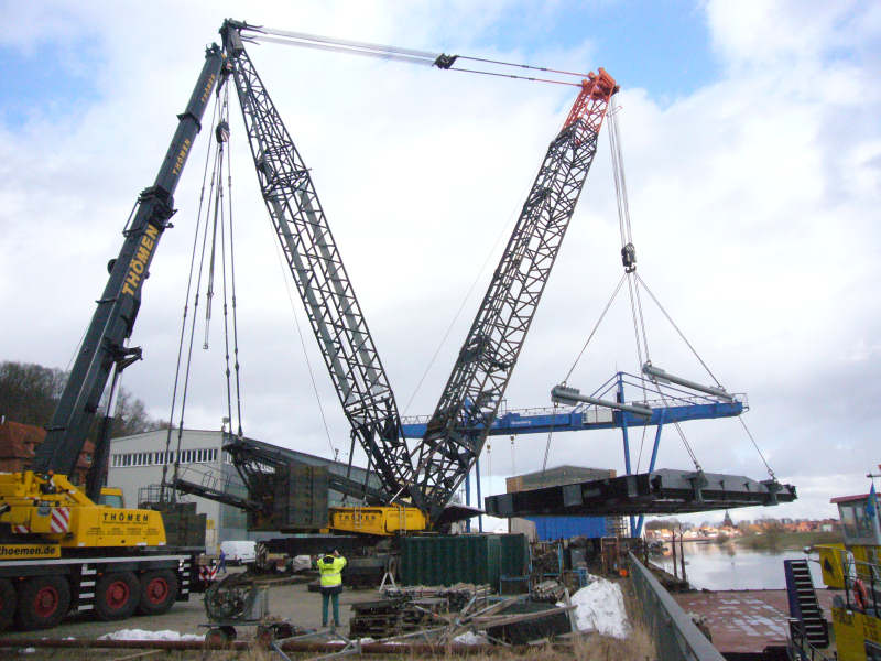 Verladung von 170 t schweren Schleusentoren für die Geesthachter Schleuse. in Boizenburg.