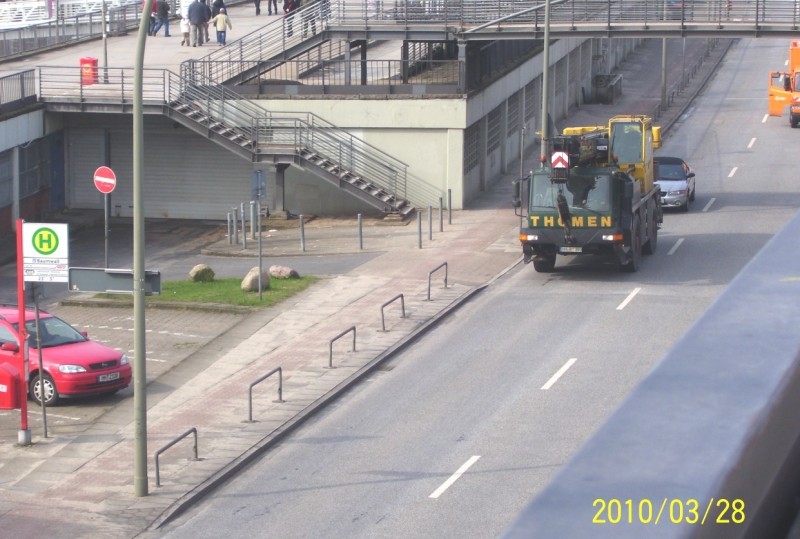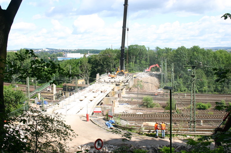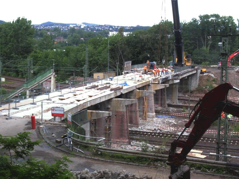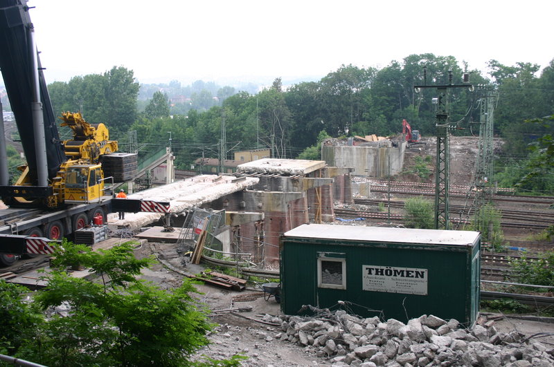 Die Brücke führt über die Gleisanlage unmittelbar vor dem Kasseler Hauptbahnhof. Der Abriss konnte nur am Wochenende erfolgen, wenn nicht so viel Zugverkehr war, da nur ein Teil der Gleise gesperrt werden sollte. Die Brücke wurde in „handliche“ Teile geschnitten, anschließend mit einem LTM 1400 von Thömen ausgehoben und vor Ort zerkleinert. Am ersten Wochenende wurde die eine Hälfte zurückgebaut und am folgenden Wochenende die andere.