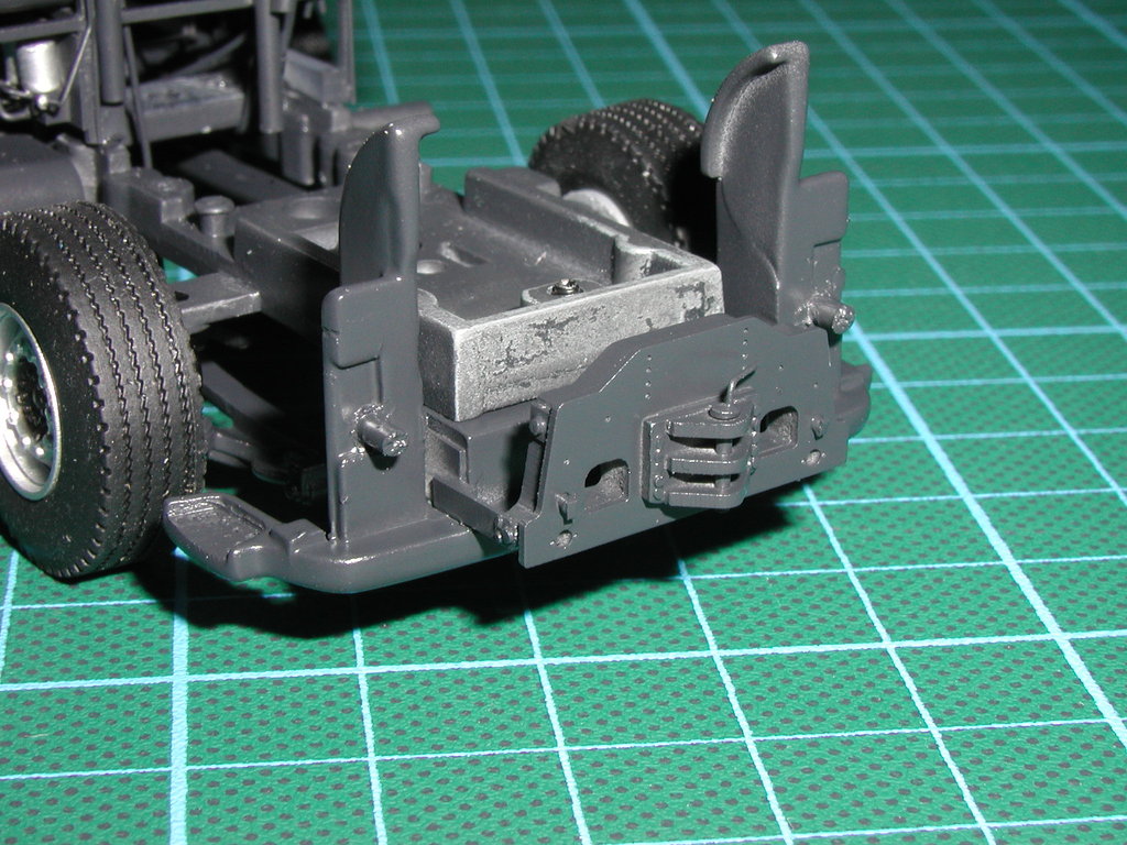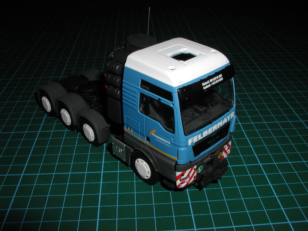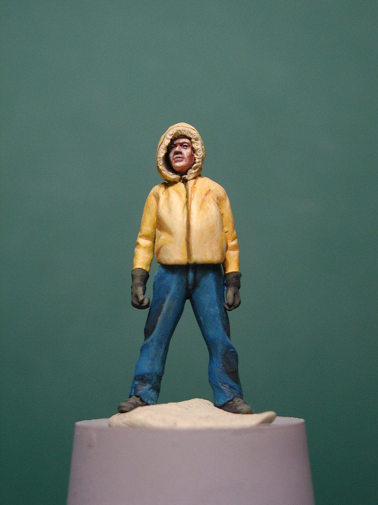 Dieses Modell bekommt auch einen Fahrer, jedoch gebe ich die Figur hinten auf die mittlere Standfläche zwischen Schwerlastturm und Sattelteller drauf, er bekommt später die beiden großen Hydraulikschläuche in beide Hände, zudem ist Winter, ich habe der Figur eine Winterjacke mit einer dicken Kapuze modelliert. Die Grundfigur ist aus Resin, der Rest (Jacke, Kapuze und verlängerte Hosen) ist selbst mit Magic Sculp (eine Zweikomponentenknetmasse, mit der ich normalerweise Figuren modeliere) selbst modelliert.