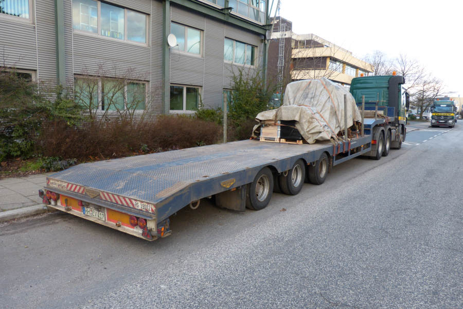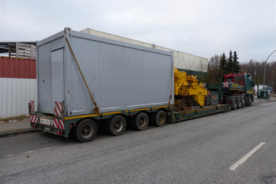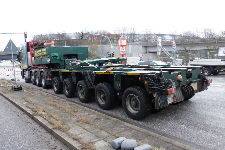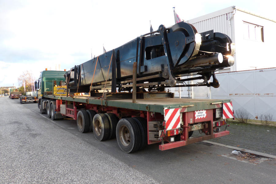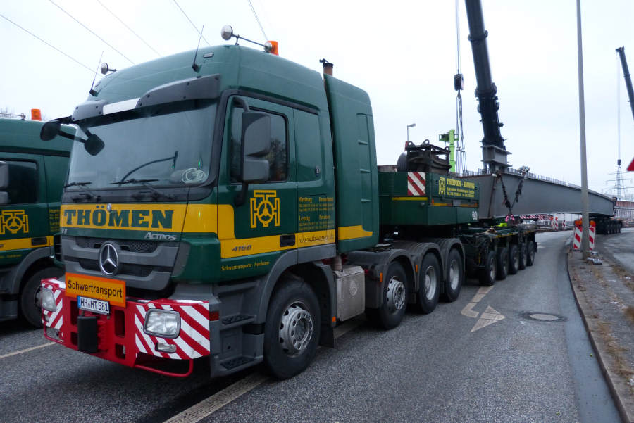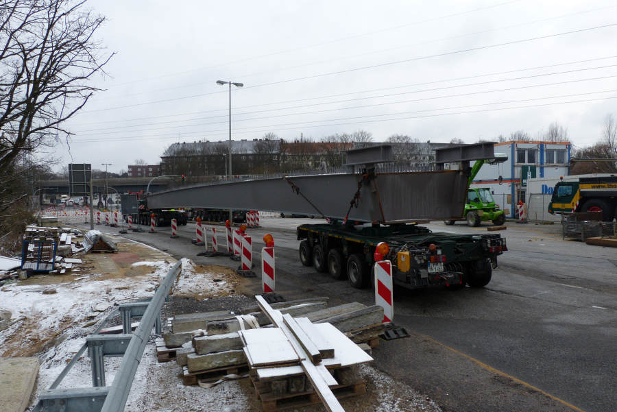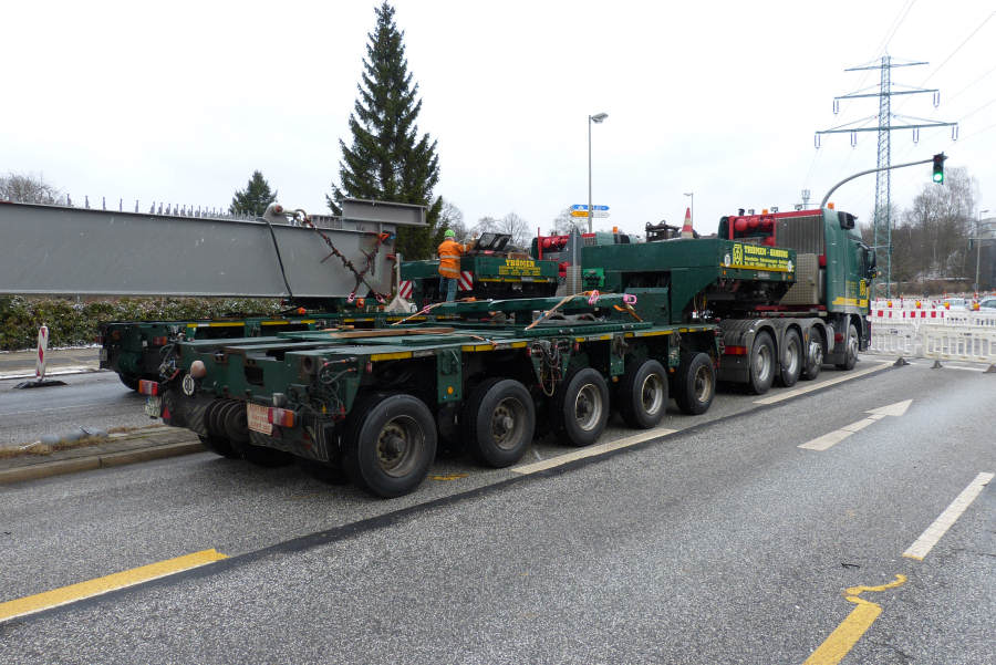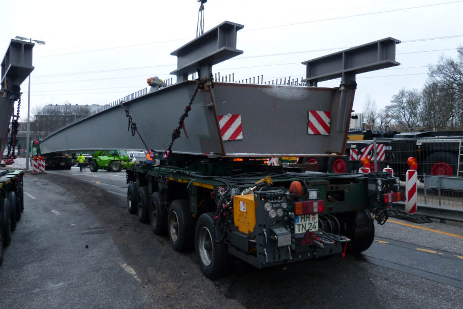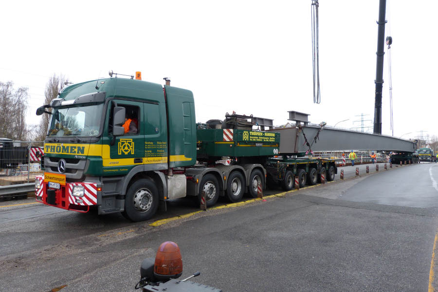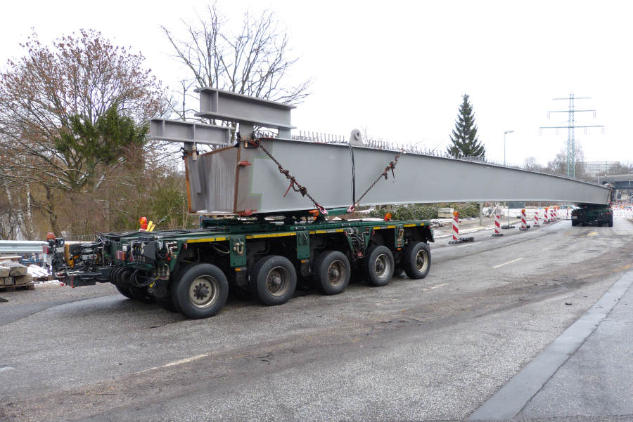 Gefahren wurden zwei 45 m lange Stahlbinder von Donges 65 und 80 t schwer.