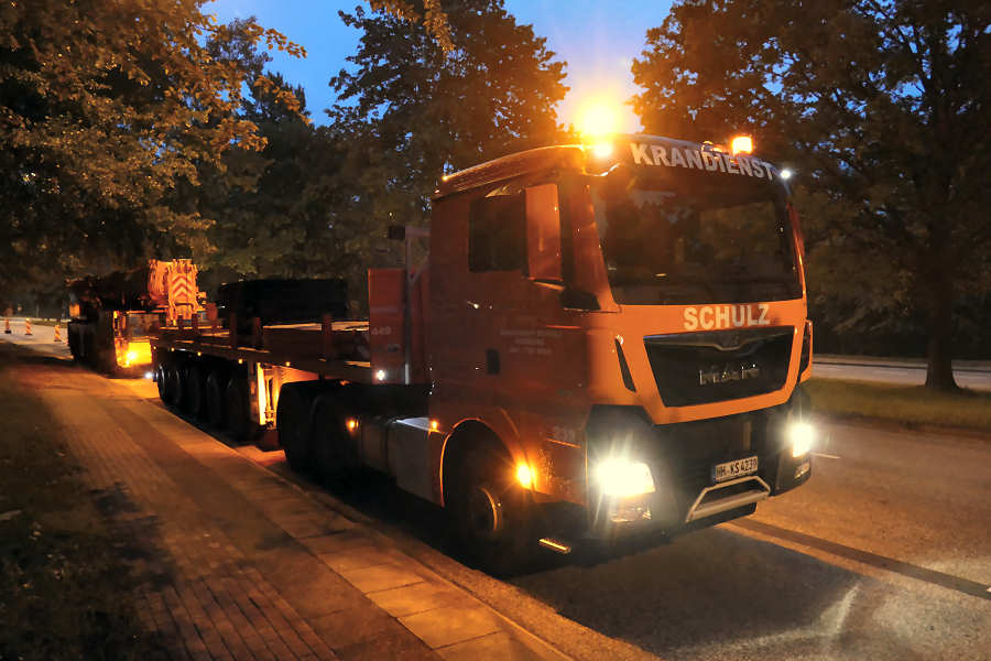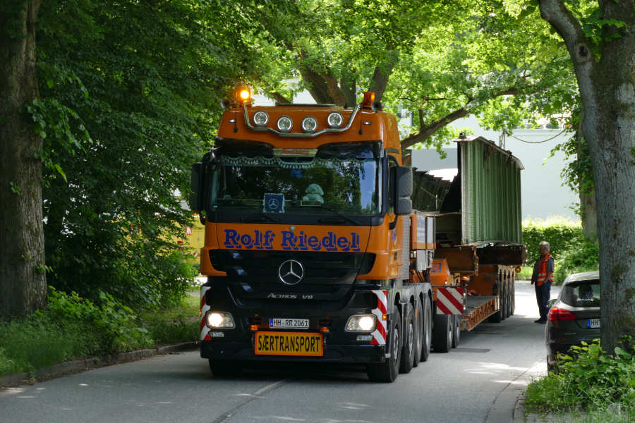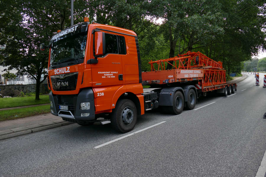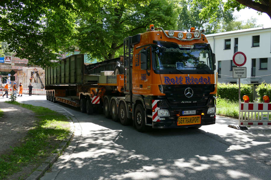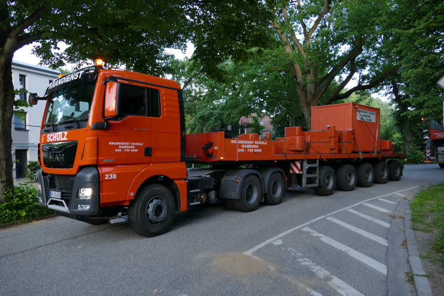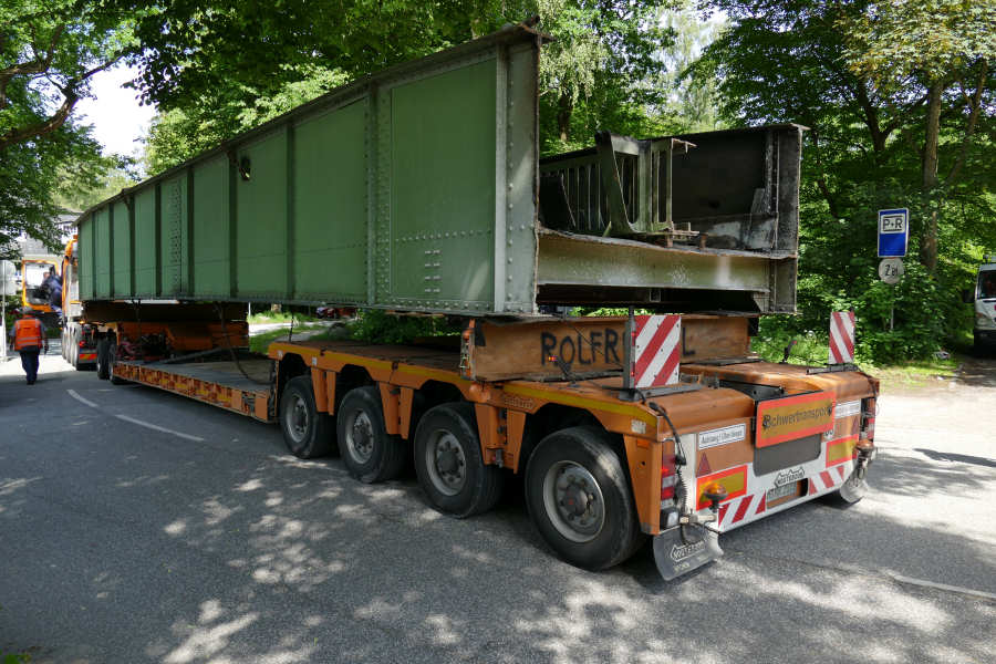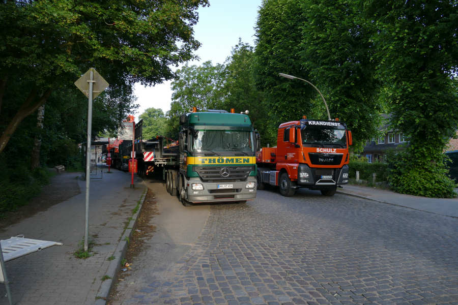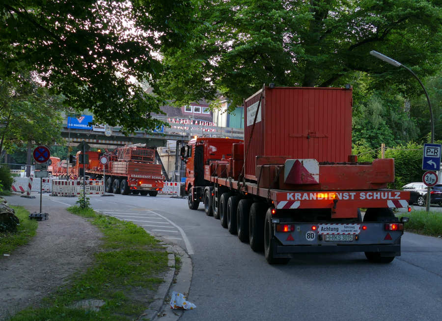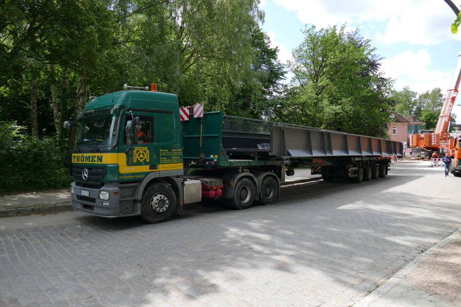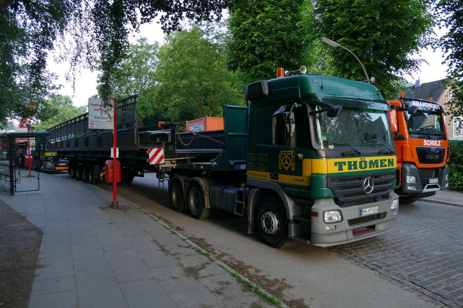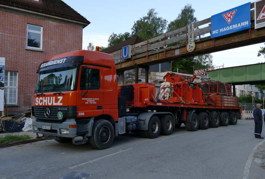 Thömen stezte die beiden Nooteboom 4achs Teletrailer mit MB 3348 MP 2 und MP 3 ein, die Brücken hatten ein Gewicht von rund 36 t. -- Beste Grüße aus dem Alstertal und den Vierlanden, in Hamburg