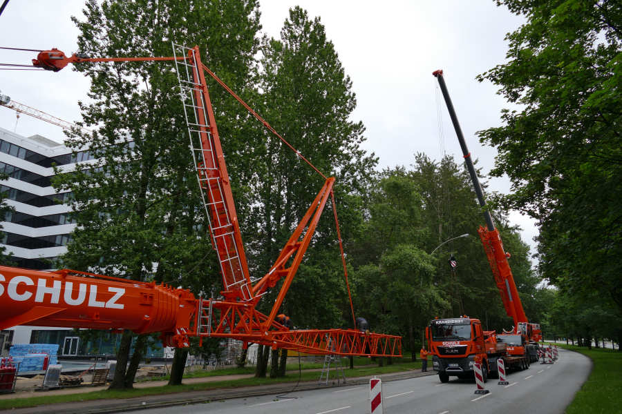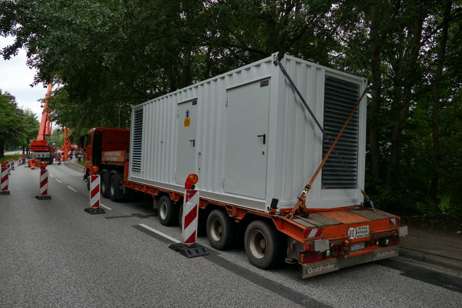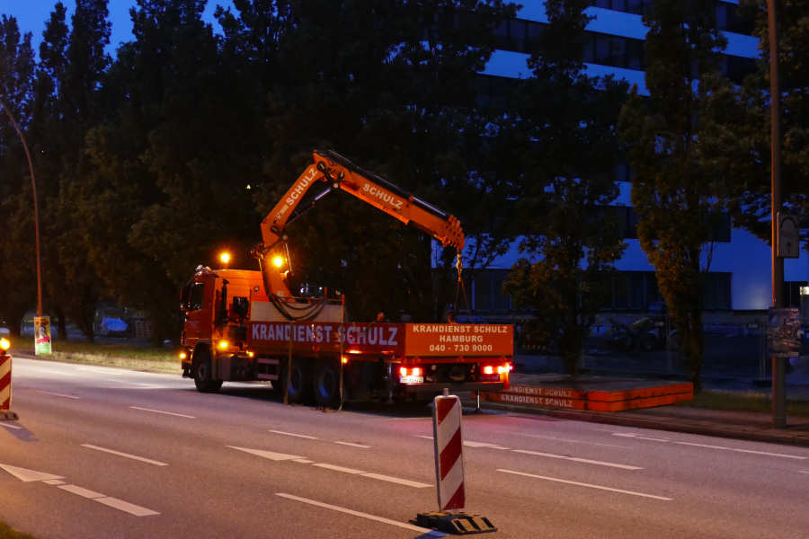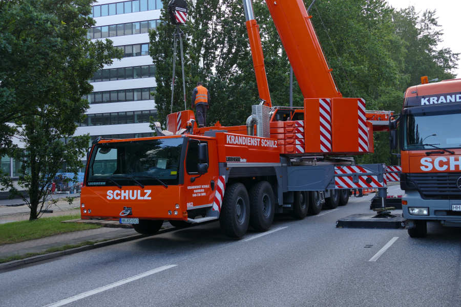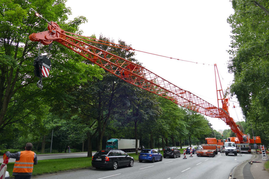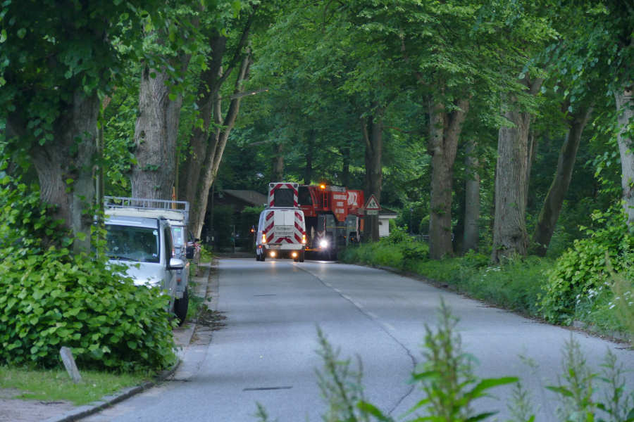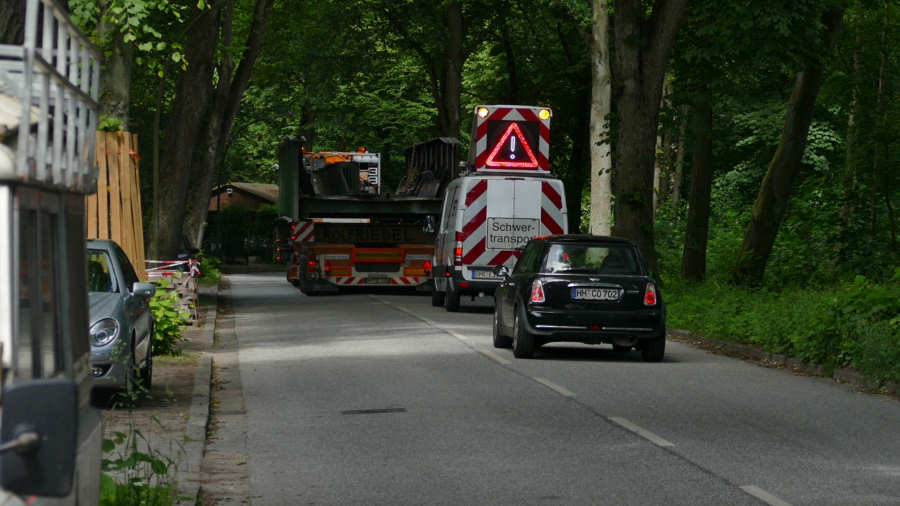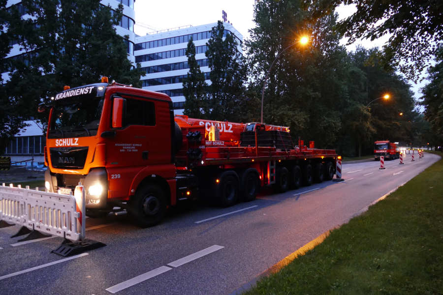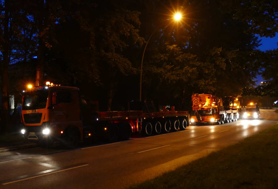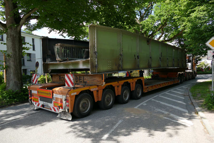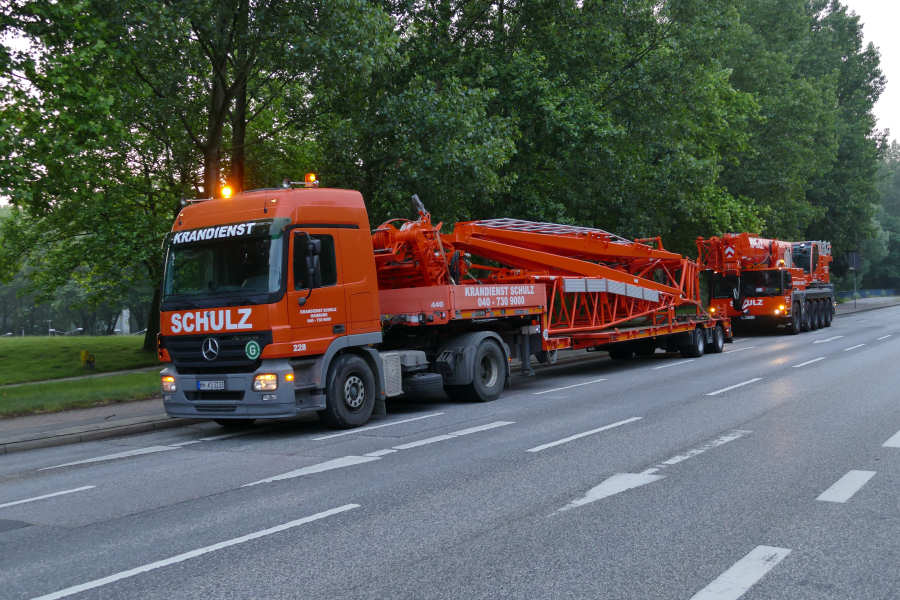 Thömen stezte die beiden Nooteboom 4achs Teletrailer mit MB 3348 MP 2 und MP 3 ein, die Brücken hatten ein Gewicht von rund 36 t. -- Beste Grüße aus dem Alstertal und den Vierlanden, in Hamburg