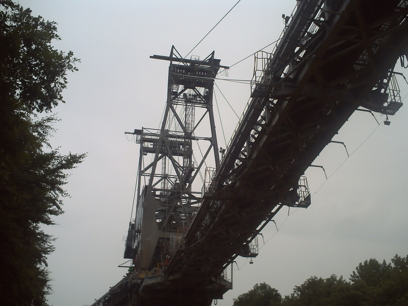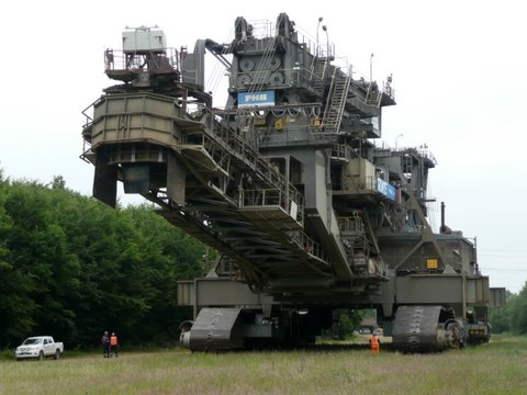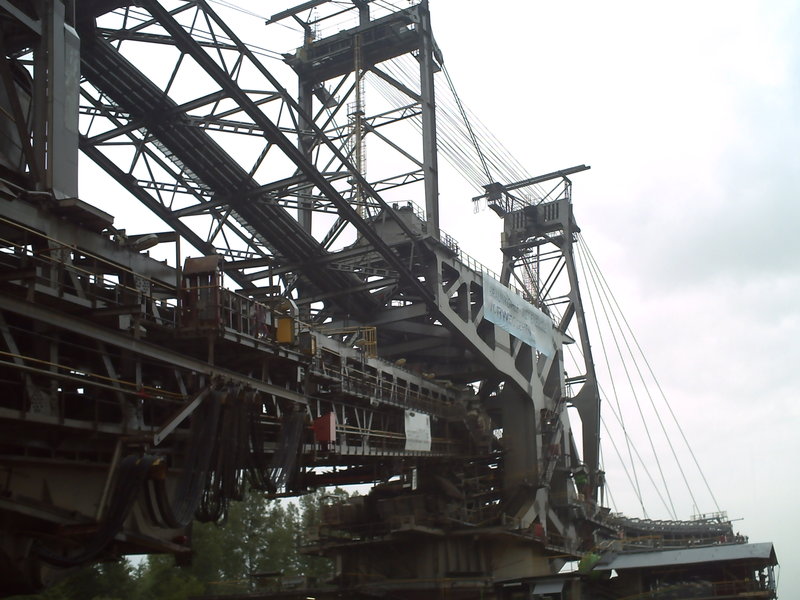 So aus der Ferne - find' ich - wirkt es als ob solch ein "Dino" sich in die Landschaft ducke... Übrigens war für mich überraschend, dass dieser Bandschleifenwagen scheinbar keine "Nabelschnur" benötigt und sich den Strom selber per Diesel erzeugt...