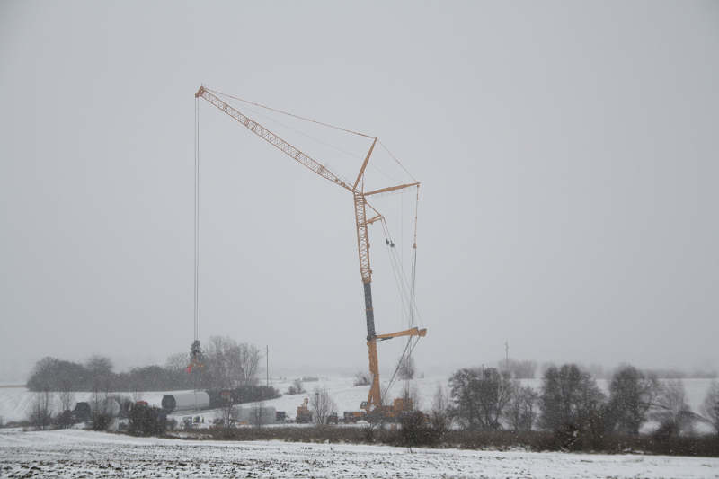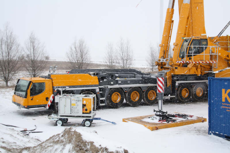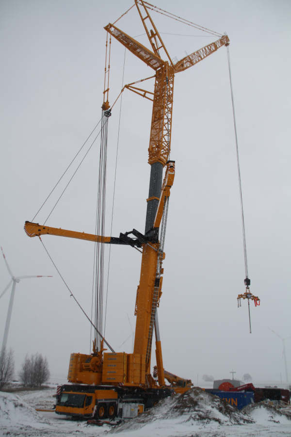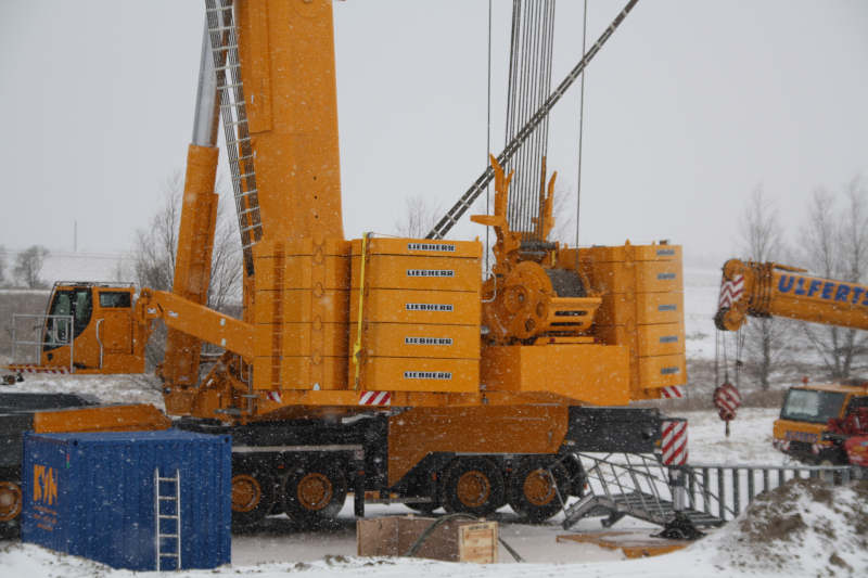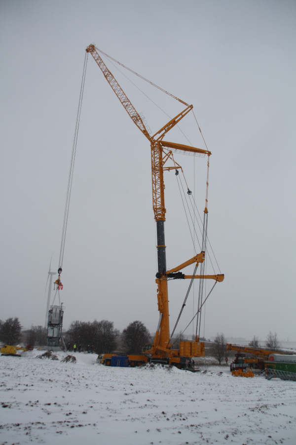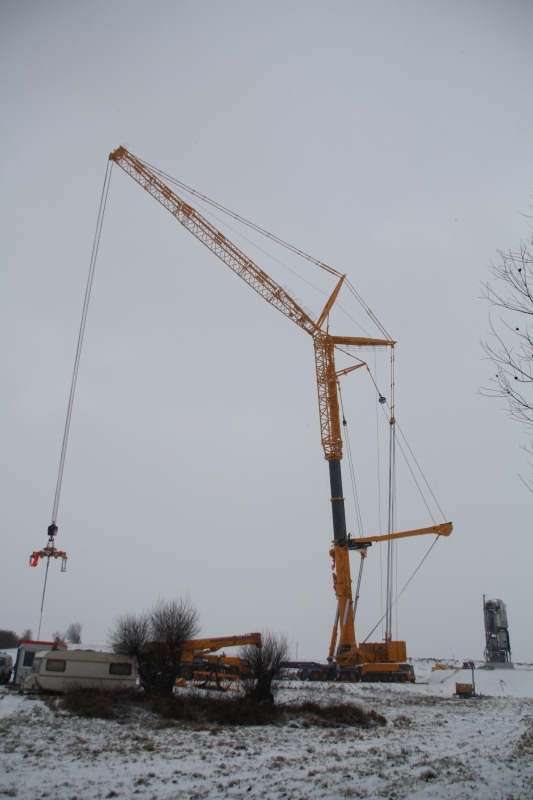 komme gerade aus der Uckermark und habe Bilder von KVN's Liebherr LTM 11200 gemacht. Er ist in T3YV2VEN mit 42m Wippe aufgebaut. Seine Aufgabe besteht darin, 3 x 2,5MW-Anlagen mit 100m Narbenhöhe aufzubauen, etwa eine pro Woche. Das Maschinenhaus lieferte Trans-Tec, die fünf Turmsegmente Universal aus Paderborn.