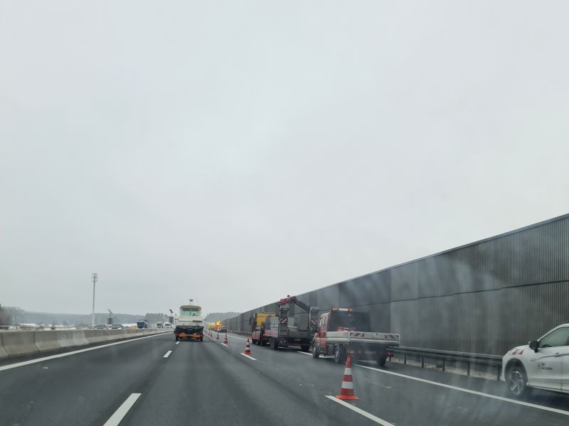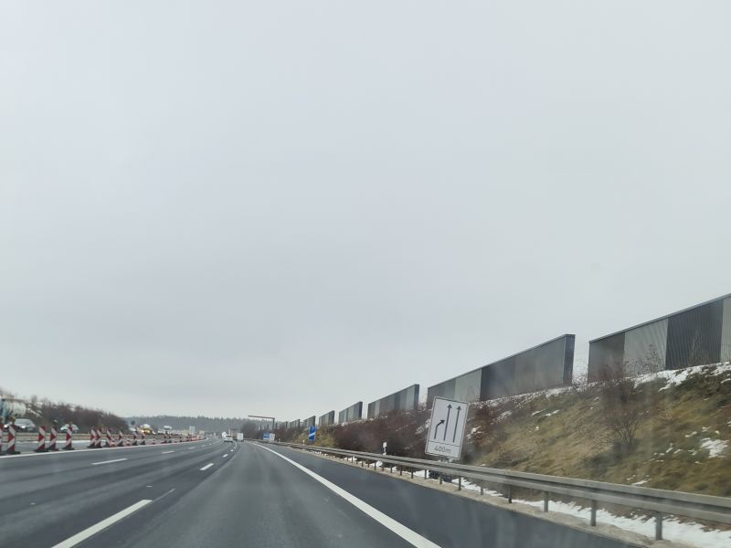 Allerdings war die Beschilderung noch suboptimal: am Ende des zweispurigen Abschnitts fehlte Zeichen 282 (jedenfalls habe ich keins gesehen) und zwischen der AS Wiesentheid und der RA Haidt, wo bislang noch der "Tempotrichter" und die Zusammenführung auf zwei Spuren war, standen auf dem Standstreifen bzw. daneben noch zwei Verkehrssicherungsanhänger, die gelb blinkten, aber keine weitere Beschilderung hatten - beides etwas verwirrend...