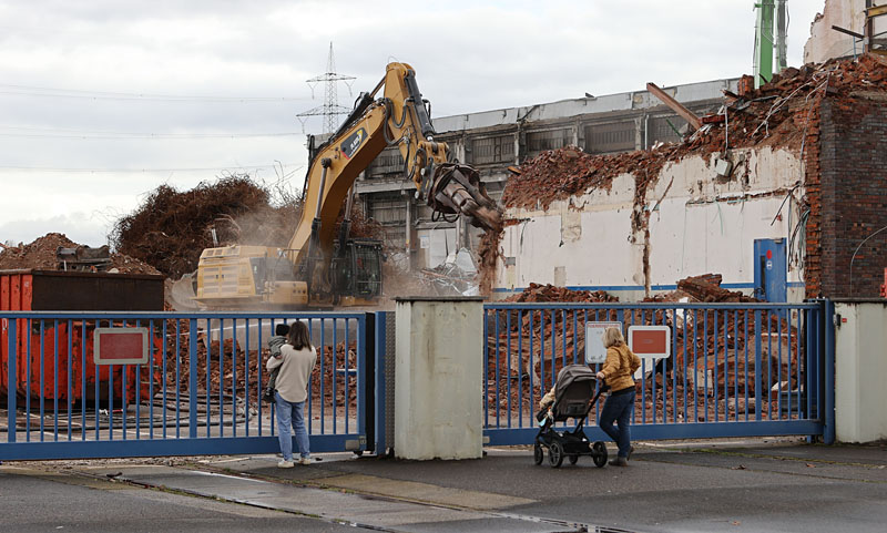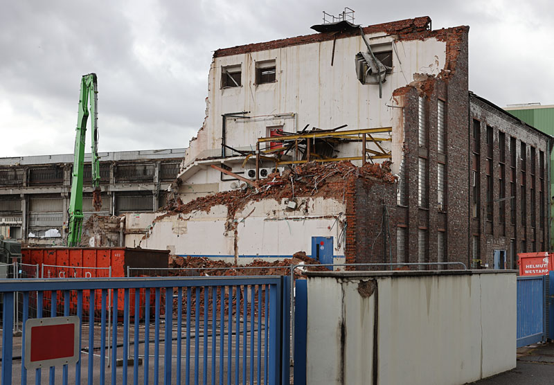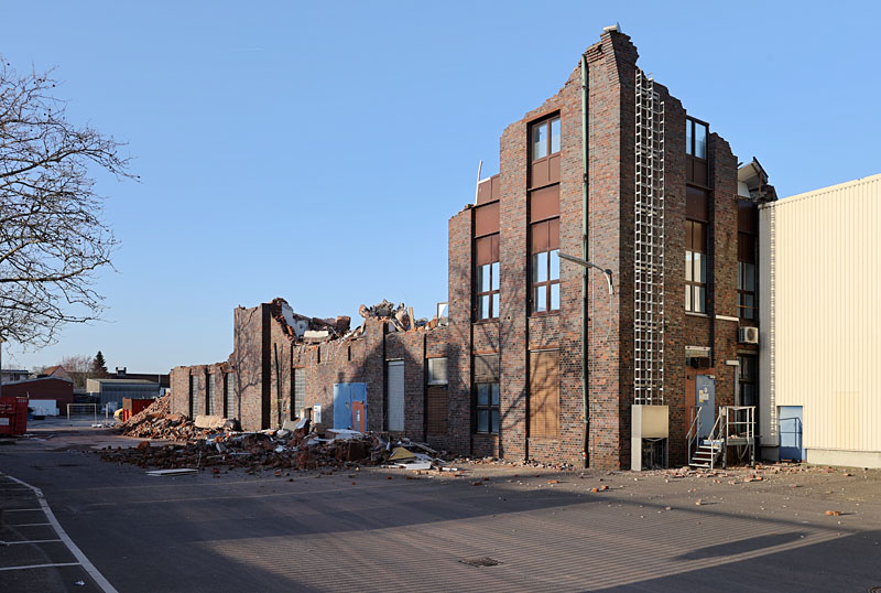 Nachdem in den letzten Wochen das Gebäude der "Hefefabrik" von der der Straße abgewandten Seite immer weiter abgetragen wurde, ging es Ende dieser Woche an der Straßenfront ziemlich schnell.