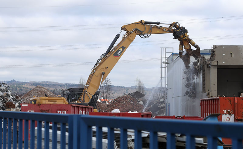 Inzwischen ist die Halle der Entrindungsanlage komplett verschwunden, lediglich der erste Teil der Trommel wartet noch auf seine Zerlegung: