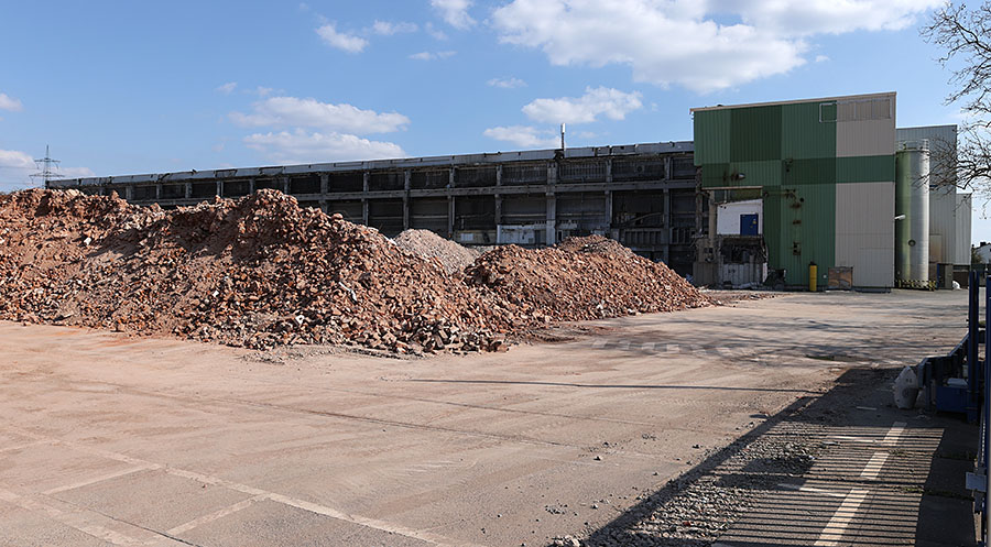 Zeitsprung zu Ende März, die Hefefabrik ist inzwischen gänzlich verschwunden. Zur Orientierung: das Grün-Beige rechts im Bild ist der letzte Rest der Halle der Papiermaschine 1, die dunkle Wand dahinter ist die Trennwand zwischen den Hallen der Papiermaschine 1 und 2.