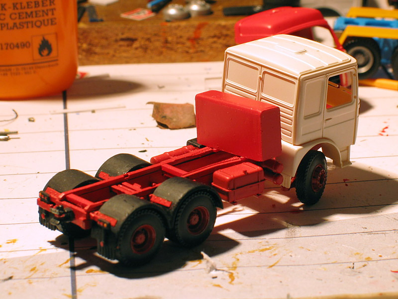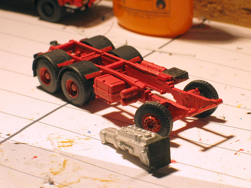 Bild 1 & 4: MAN 26.321 DFS Schmidbauer Fahrgestellrahmen + Fahrerhaus Herpa, Tanks und Aggreate aus der Bastelkiste, Motorblock + Hilfsrahmen Eigenbau aus diversen Bastelteilen, Räder B&S. Fahrgetsell soweit fertig, Fahrerhaus bislang nur grundiert.